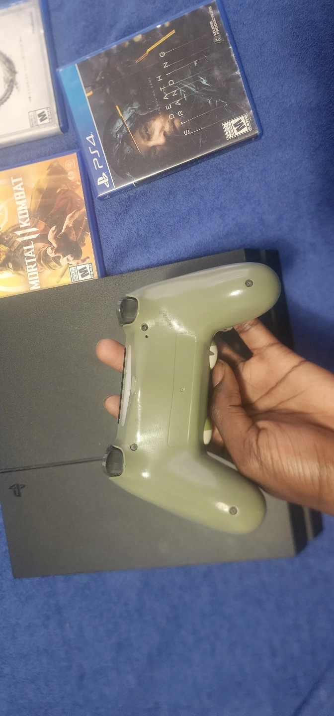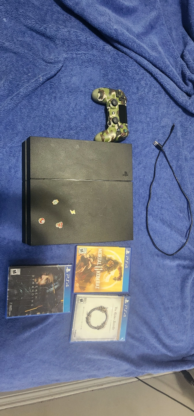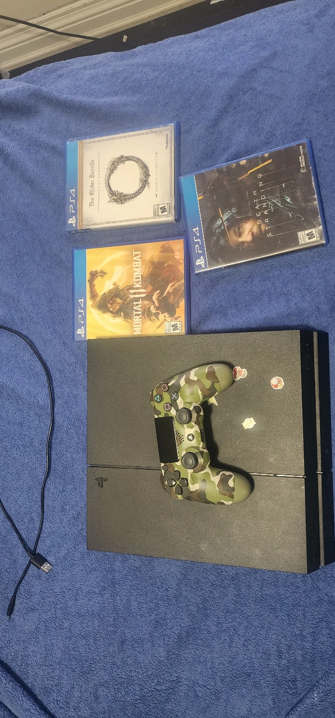PS4 console, camouflage controller, power cable, and three games: Mortal Kombat 11, Death Stranding, and The elder controllers. Games are in good condition, console and controller in perflectly fine condition