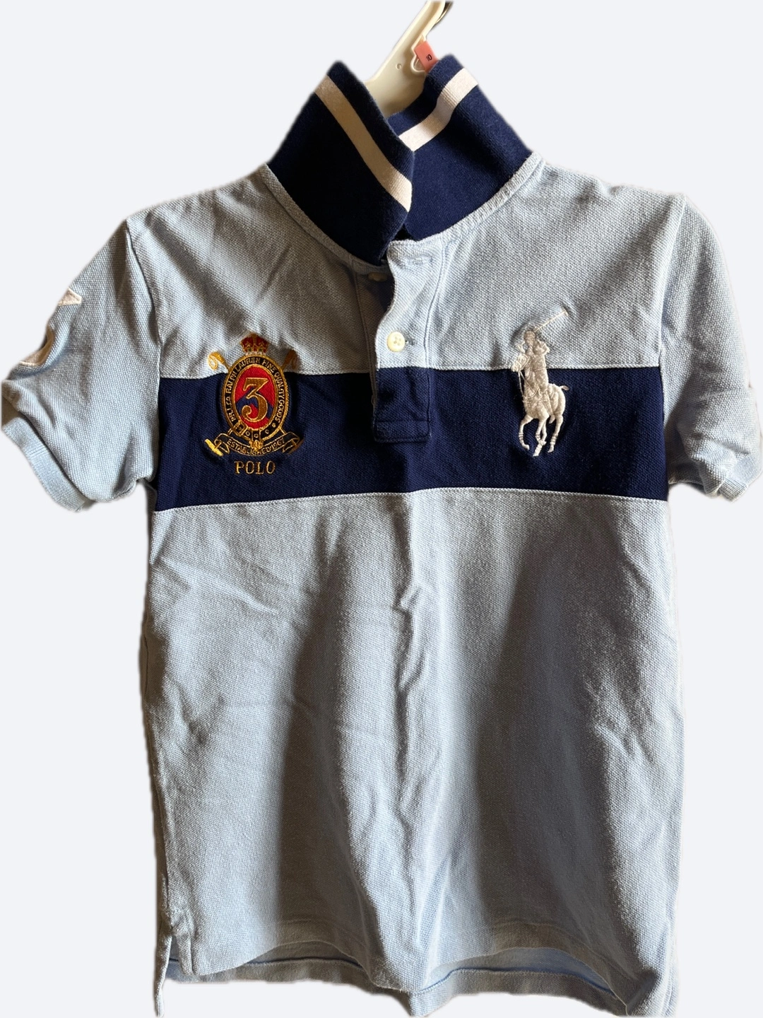 Light blue and navy polo shirt. Size 7. Embroidered details. Short sleeves. Collared. Excellent condition