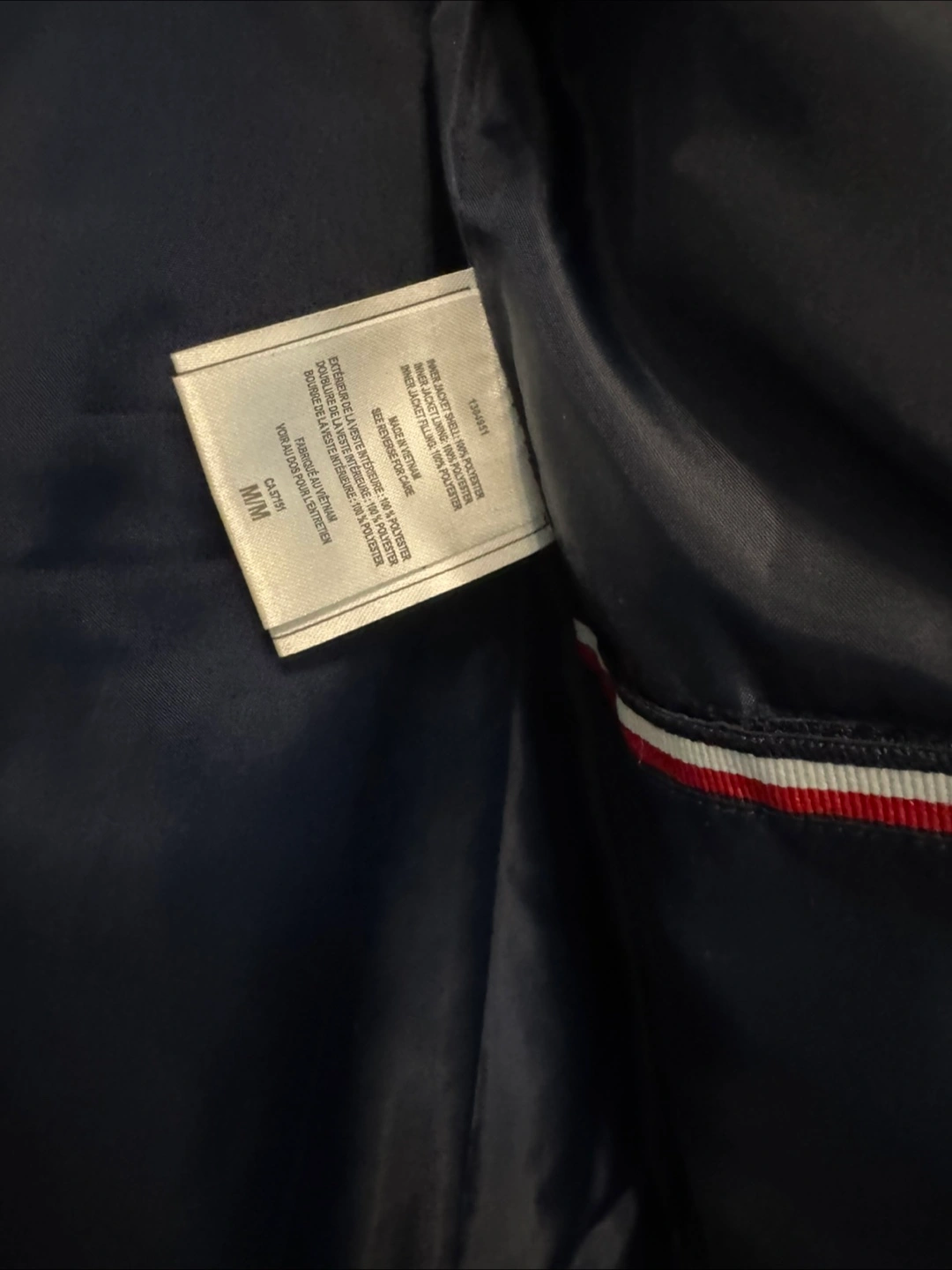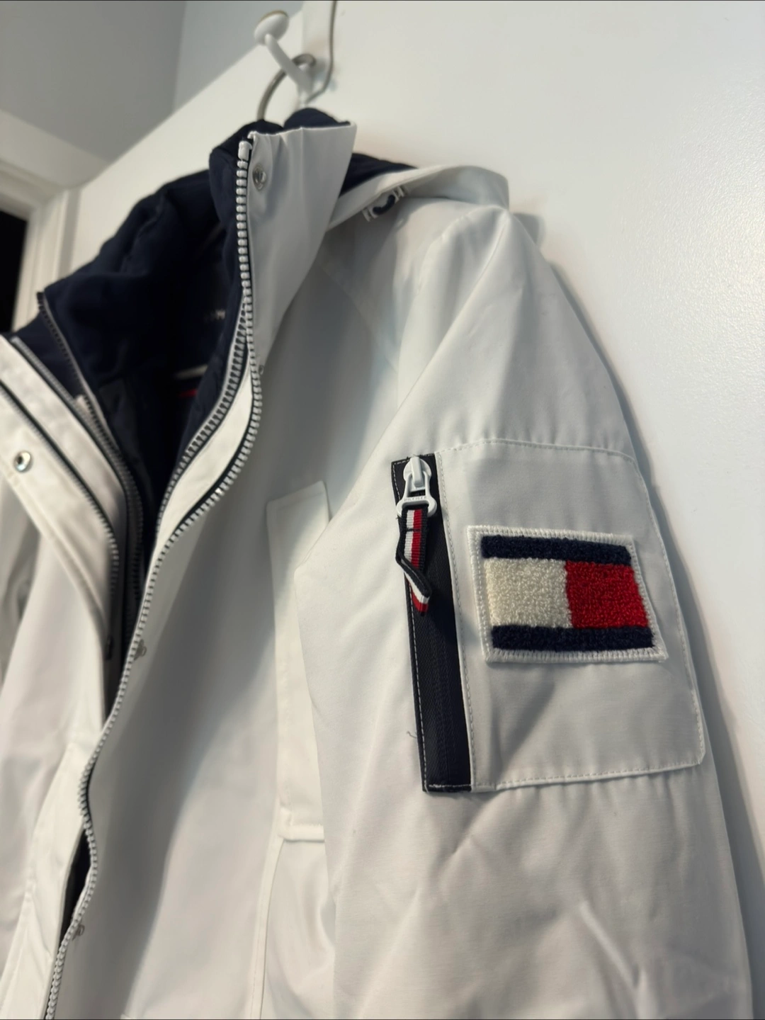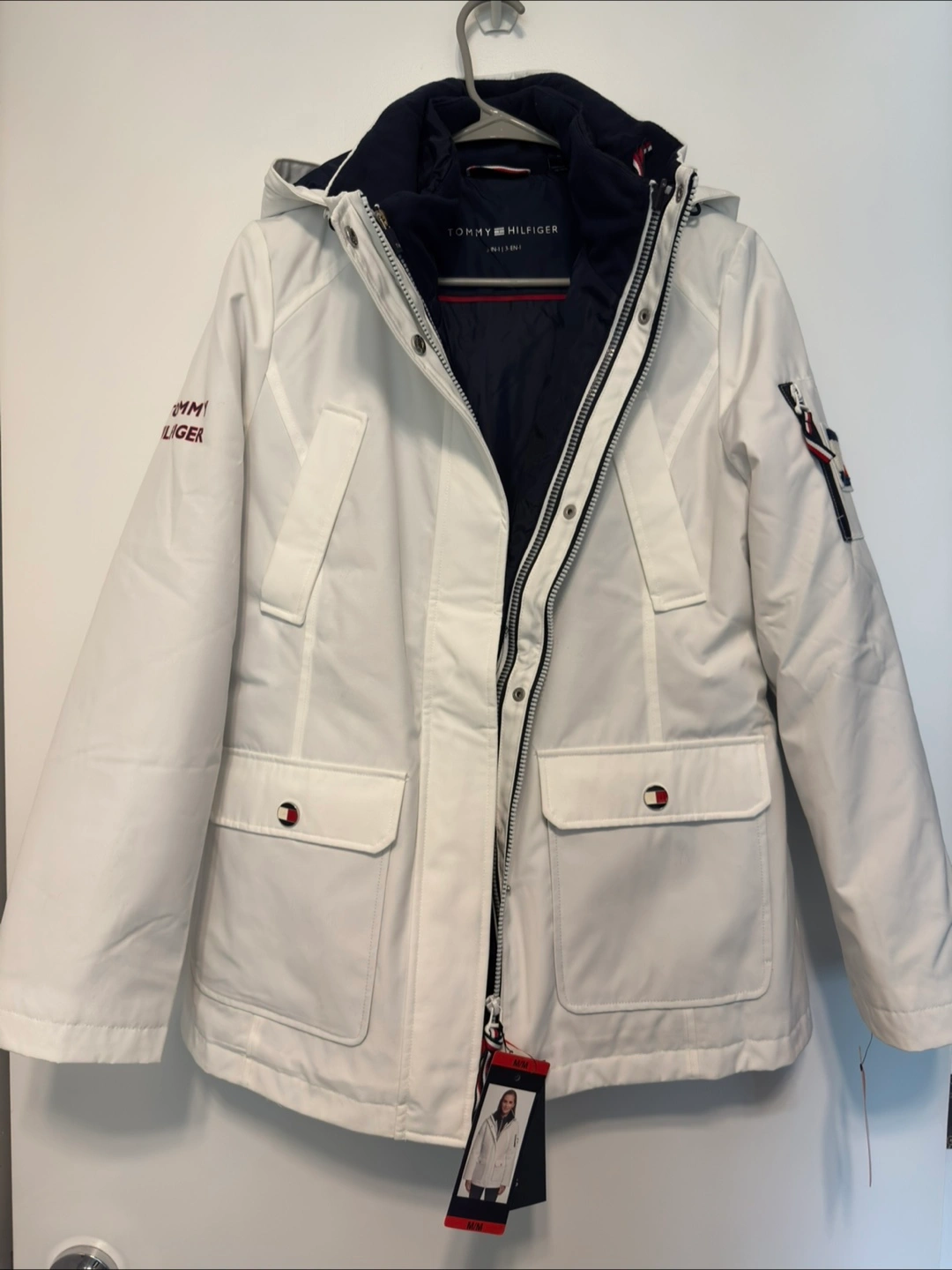 Women's white hooded jacket. Size medium. Features Tommy Hilfiger branding. Long sleeves, pockets, and a drawstring waist. 3-in-1. Brand new.