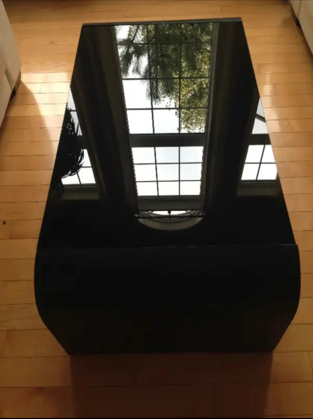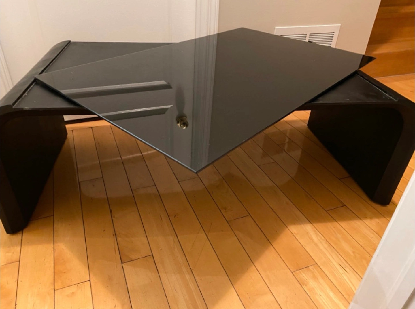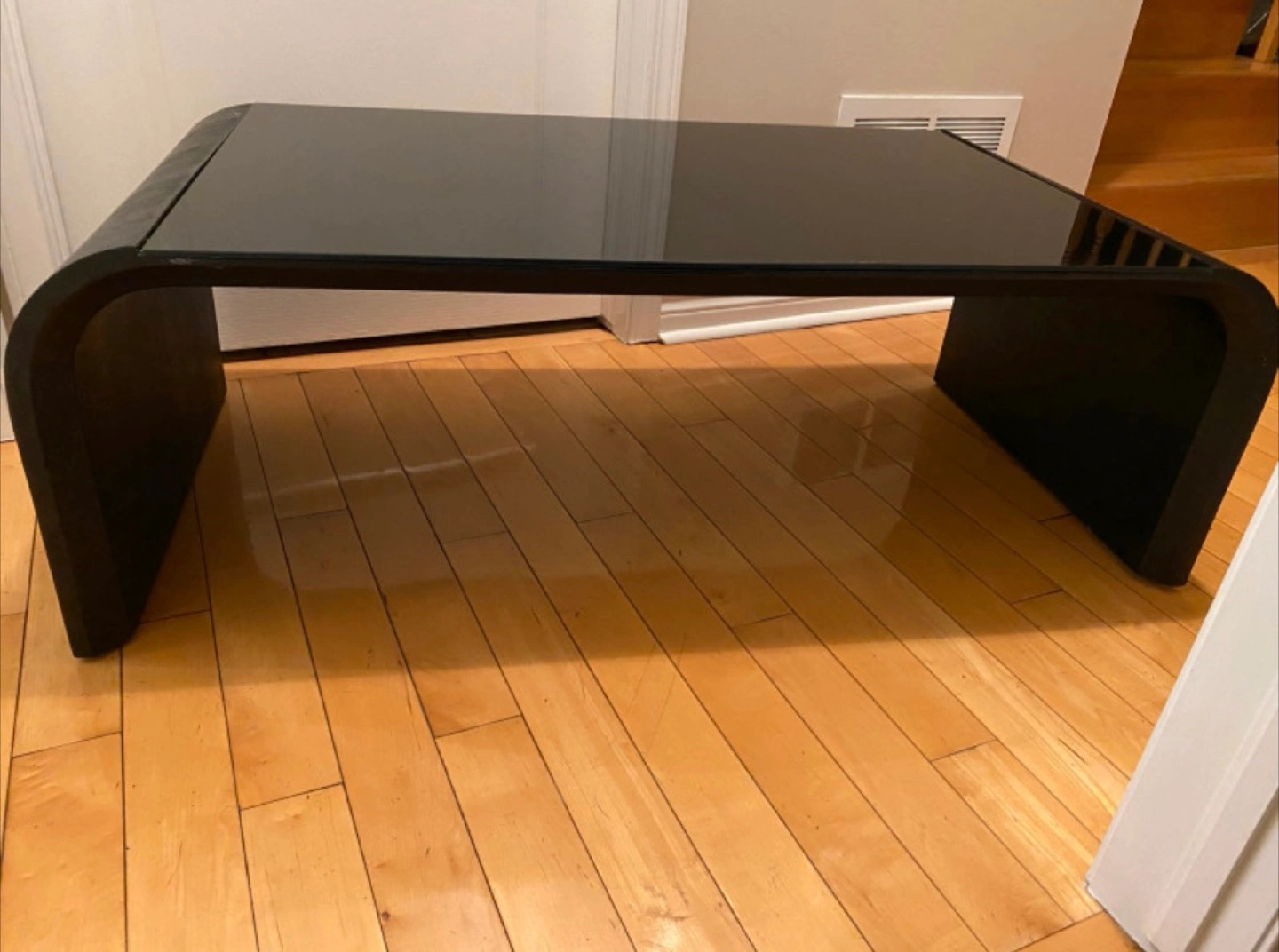 10Contemporary coffee table. Features a curved black base and a large black glass top. Perfect for a modern living room. Details: - No damage at all - Glass top is removable for easy cleaning and travel - Originally purchased from Leon’s for $563.87 including tax - Asking only $199 - 47” L x 24” W x 16” H Accepting cash only If you see the post, then it’s available. Feel free to message me with any questions!