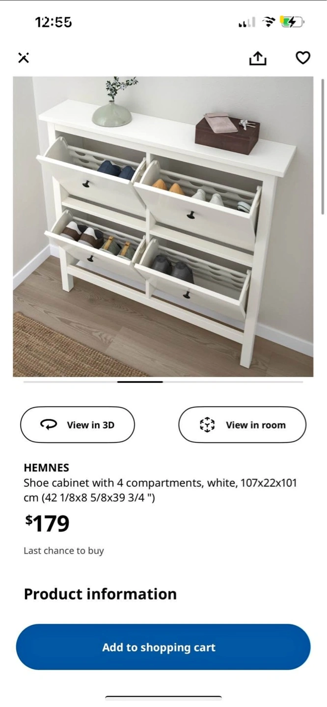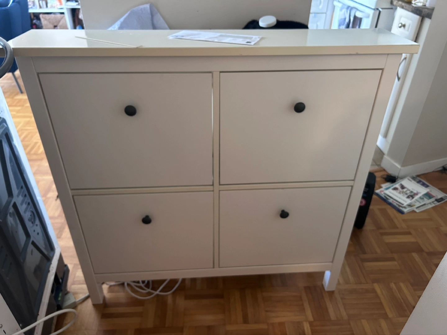 White shoe cabinet with four compartments. Good condition. Simple design, easy to assemble. Measurements in the pic.