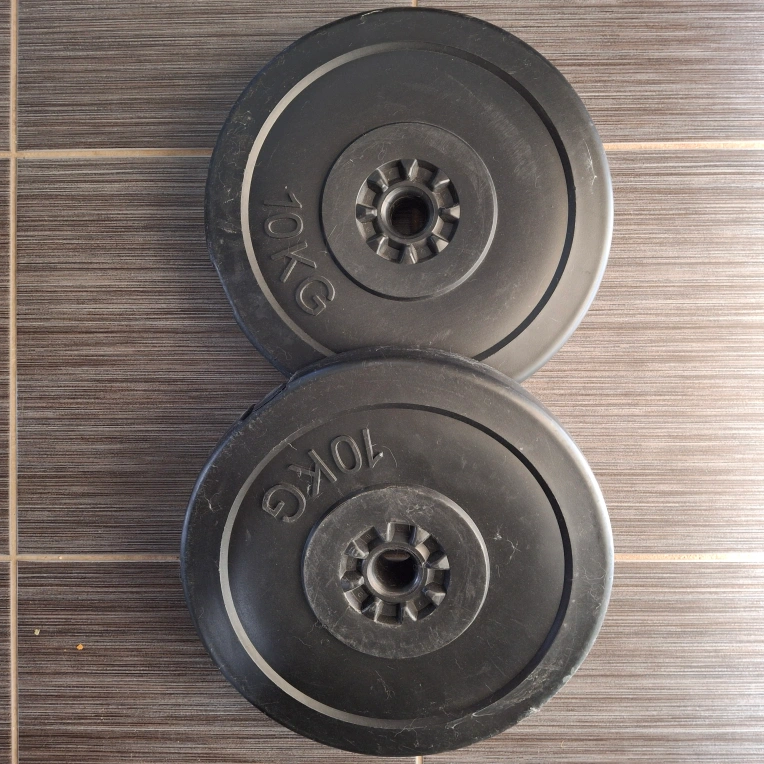 2 x 10 kg (22 lb) sand-filled plastic weight plates for 1" dumbbells or barbells, good used condition. Note that these are for 1" bars, NOT Olympic bars.
