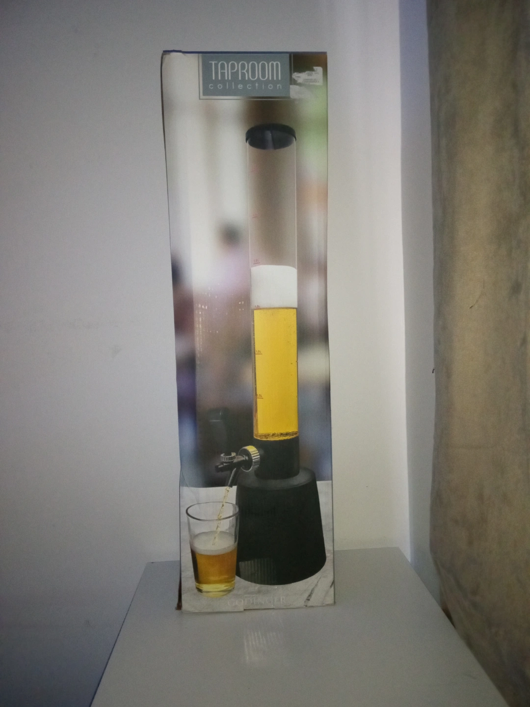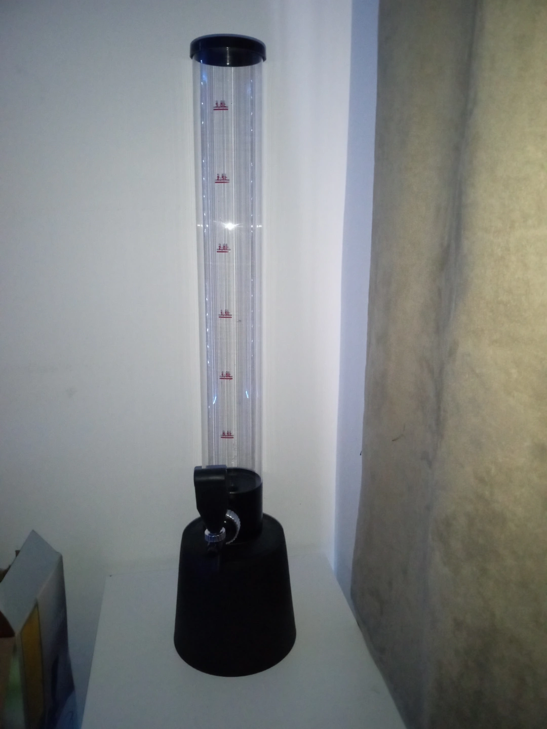 Tall clear acrylic dispenser. Black base. Includes tap. Great for parties.