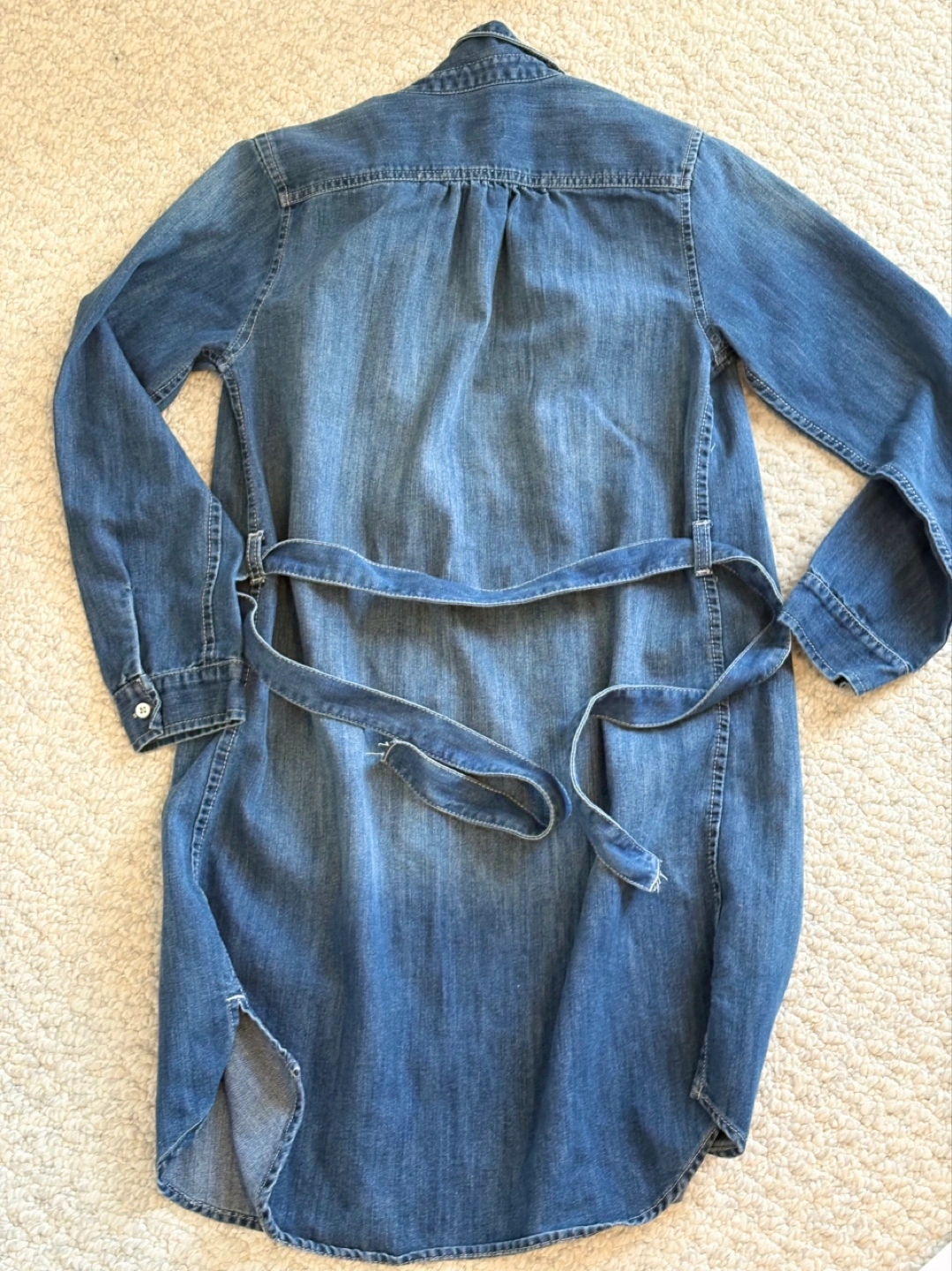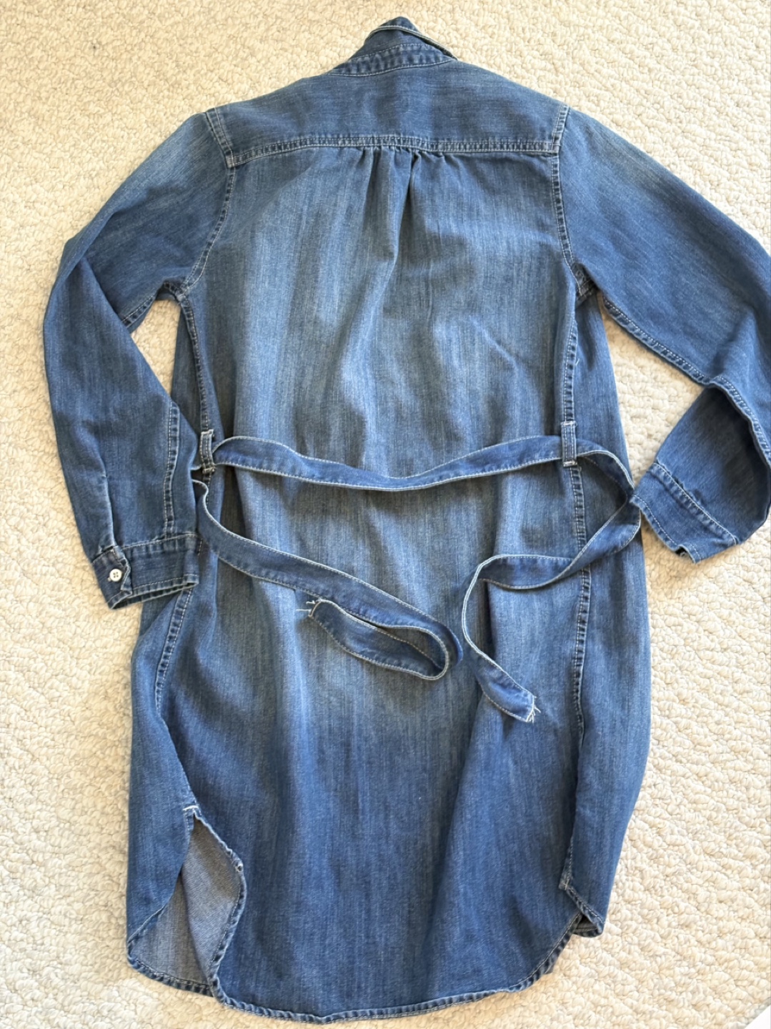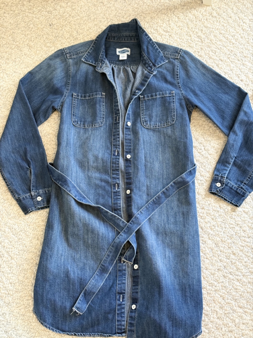Long sleeve denim shirt dress. Button closure. Belted waist. Two chest pockets. Great for layering or wearing alone.