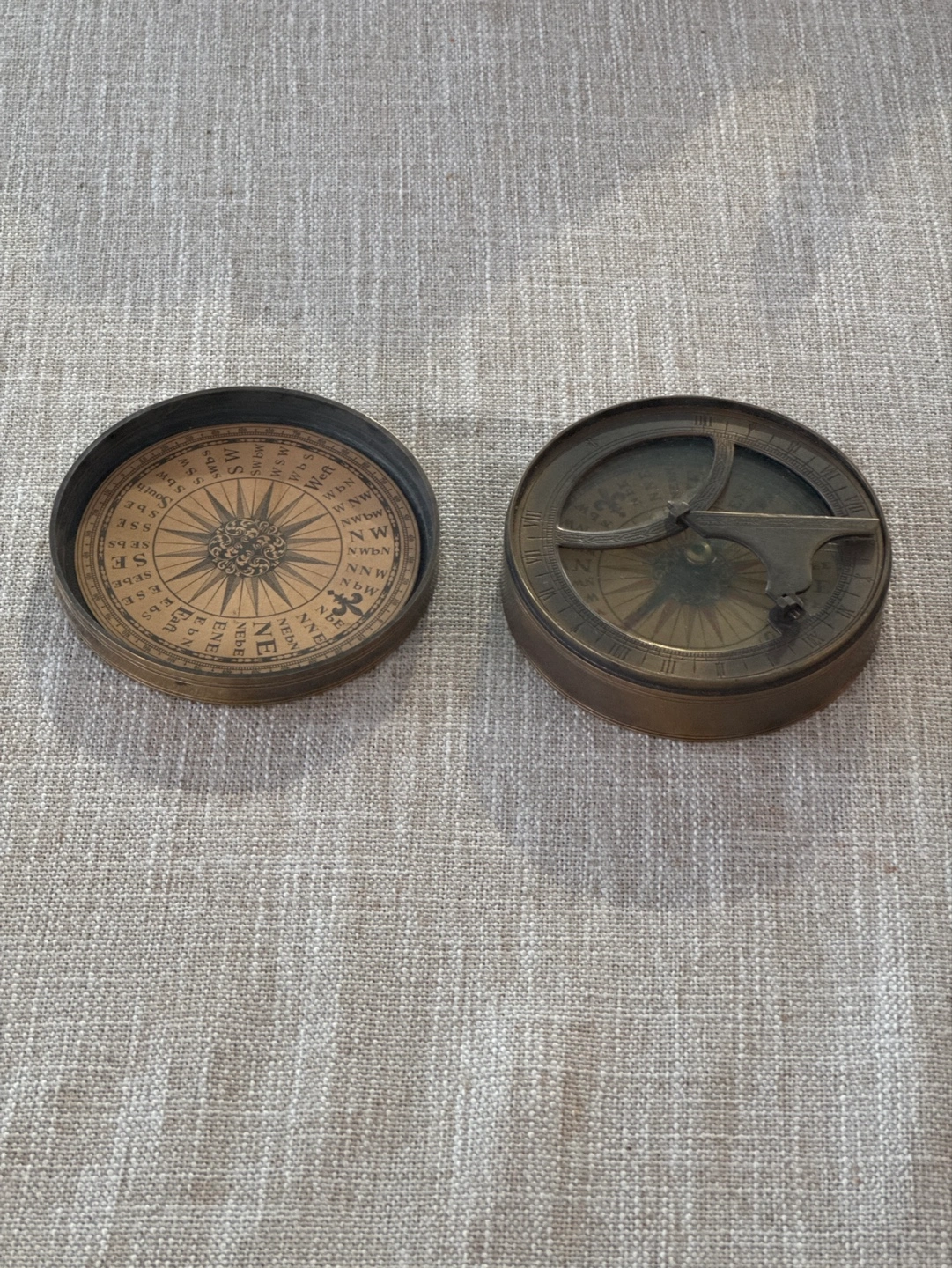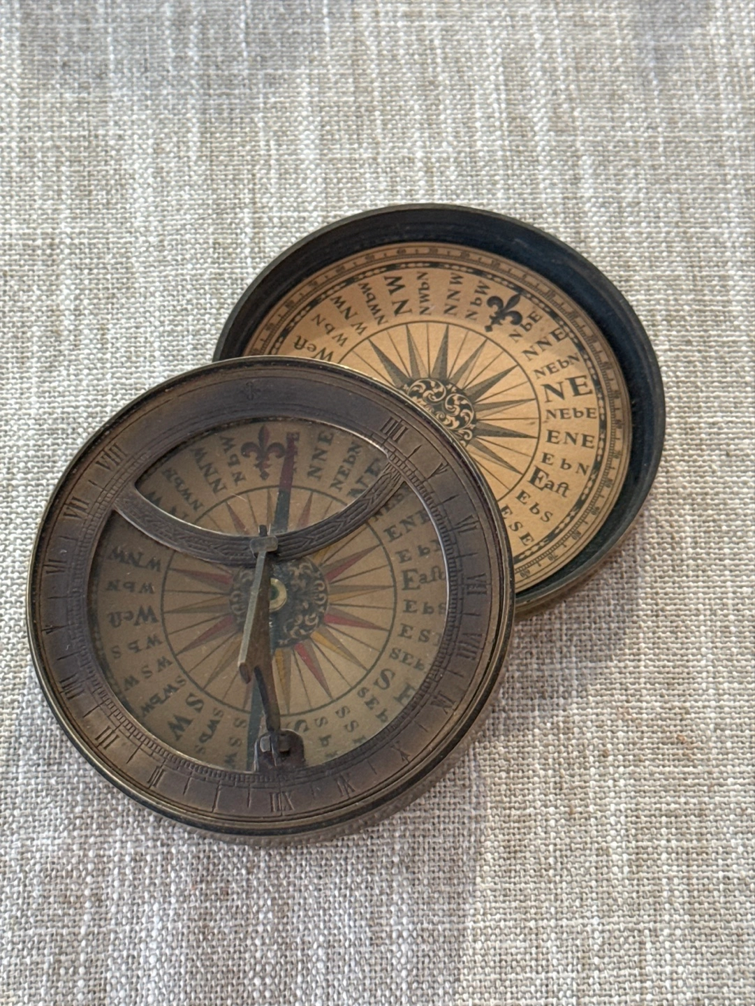 Vintage brass sundial compass. Two-piece design. Features a compass rose and hour markings. Shows some signs of age and wear. A unique collectible.