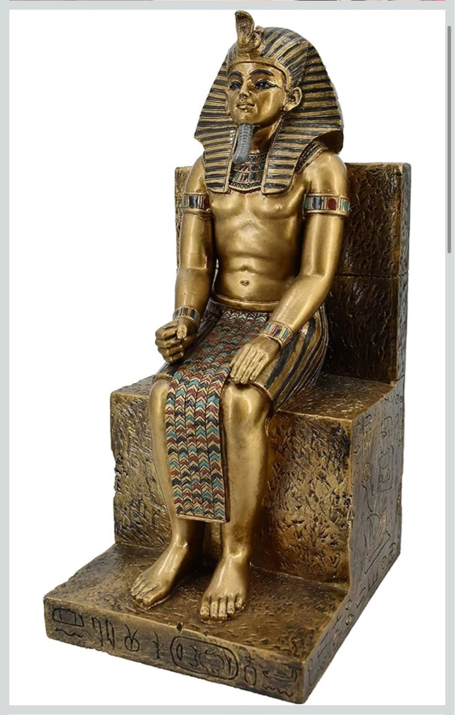Pair of ornate bookends. Gold-toned finish. Detailed design. Features a seated pharaoh. Perfect for adding a touch of history to your home.