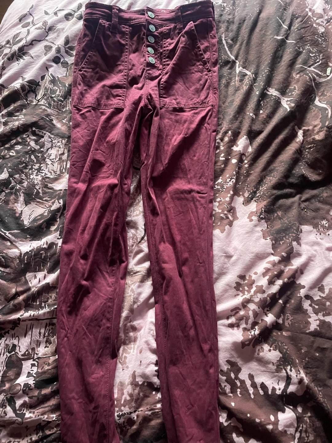 High-waisted pants. Button fly. Slim fit. Burgundy colour.