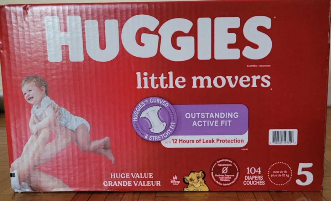 Box of Huggies Little Movers diapers, size 5. Disney patterns. 104 diapers.