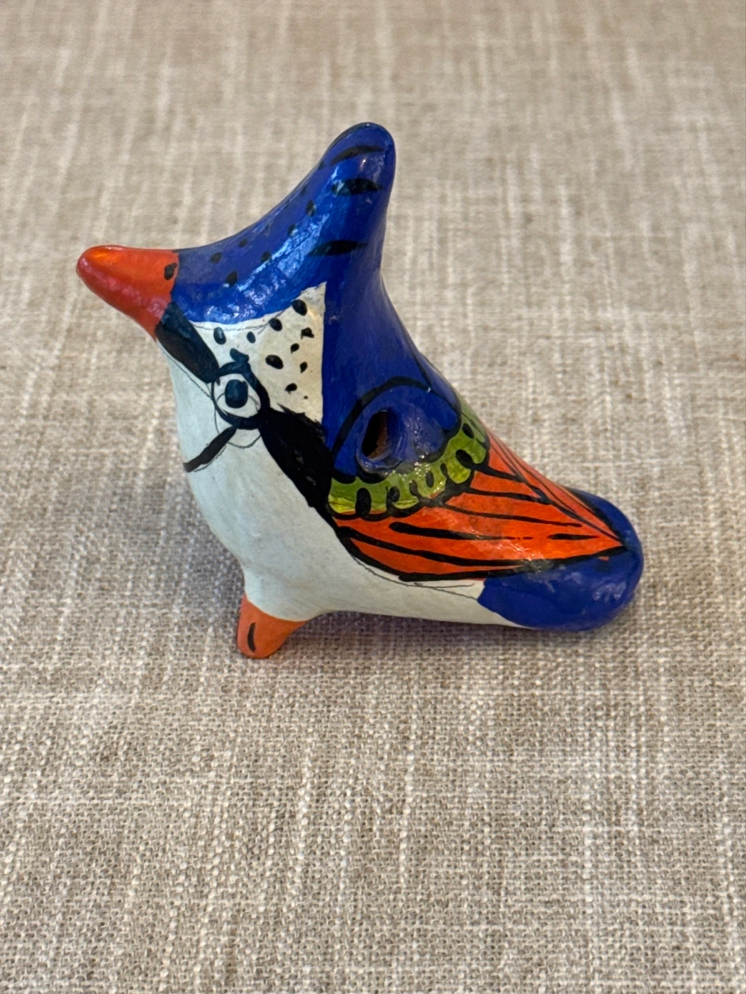 Charming hand-painted ceramic bird whistle. Small size. Vibrant colours. Unique design. Perfect for collectors or as a quirky gift.