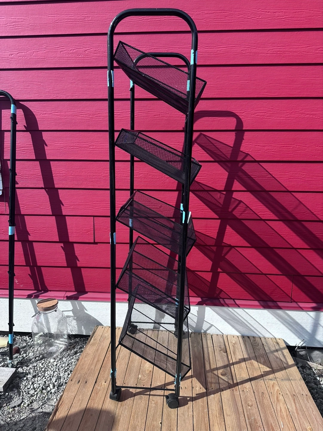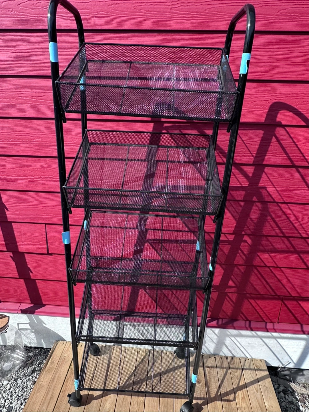 Five tiered rolling cart. Black metal frame. Mesh wire baskets. Great for organization or storage. Wheels for easy mobility. Two units available