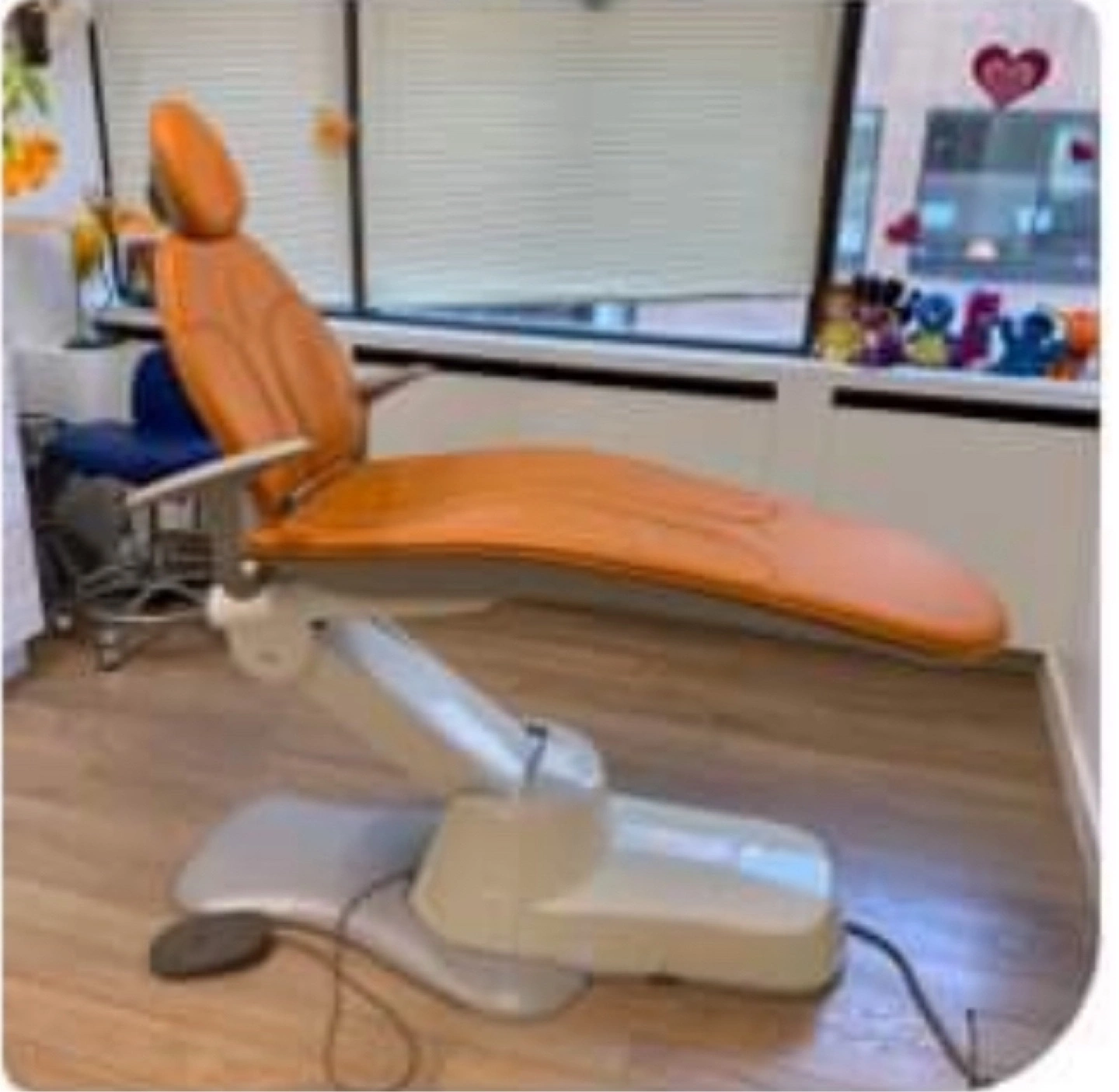 Comfortable dental chair. Orange upholstery. Good working order. Modern design. Includes base and controls.
