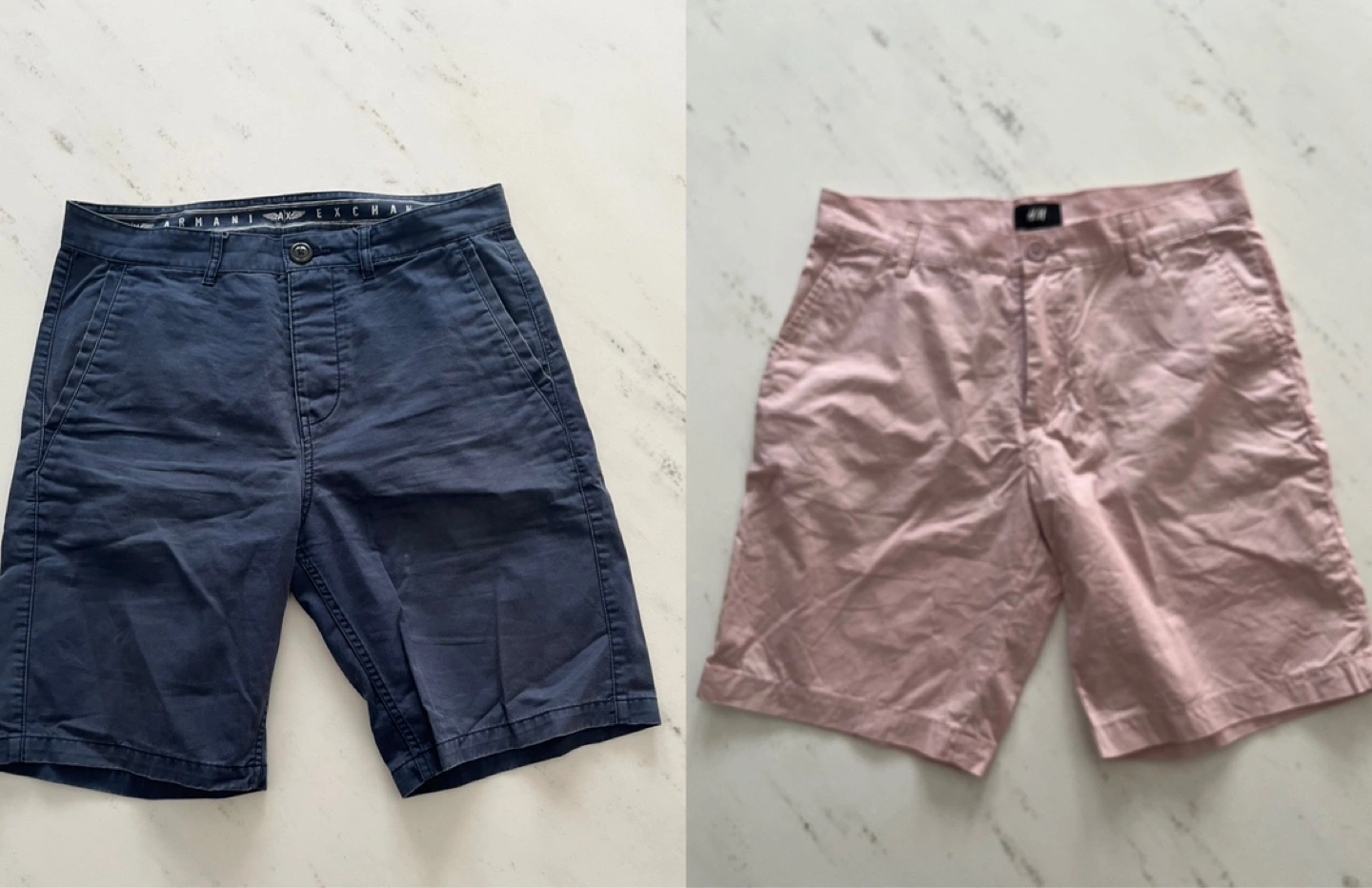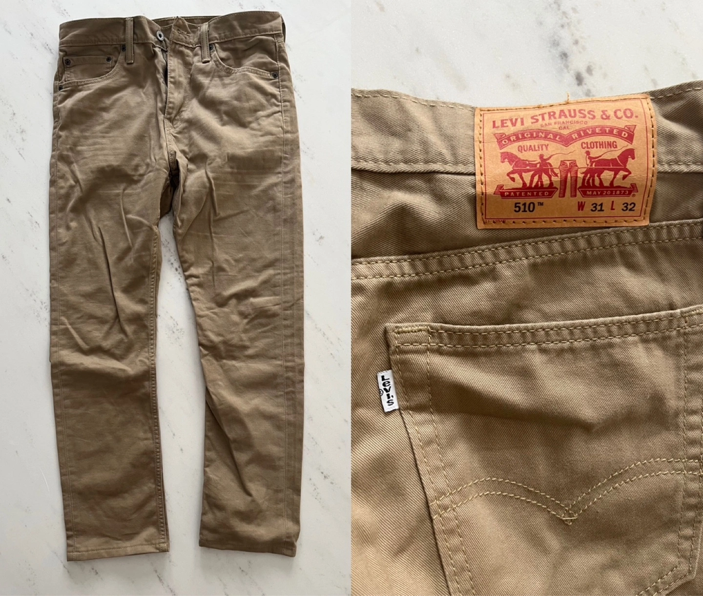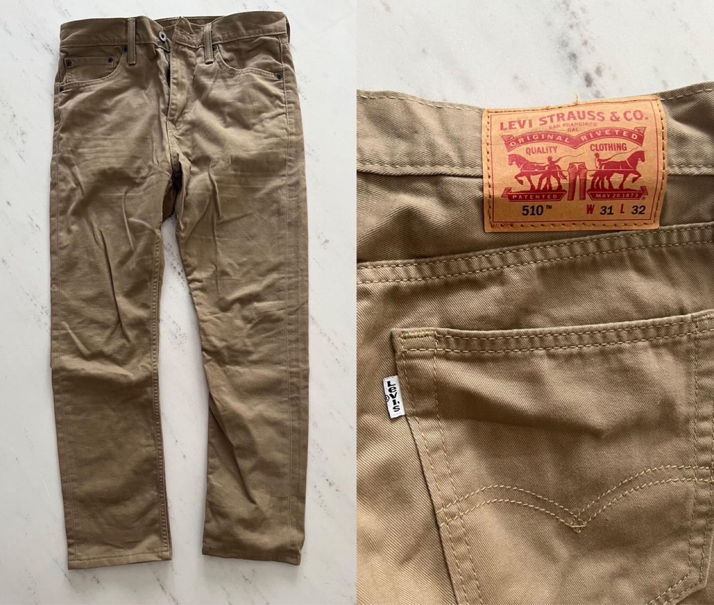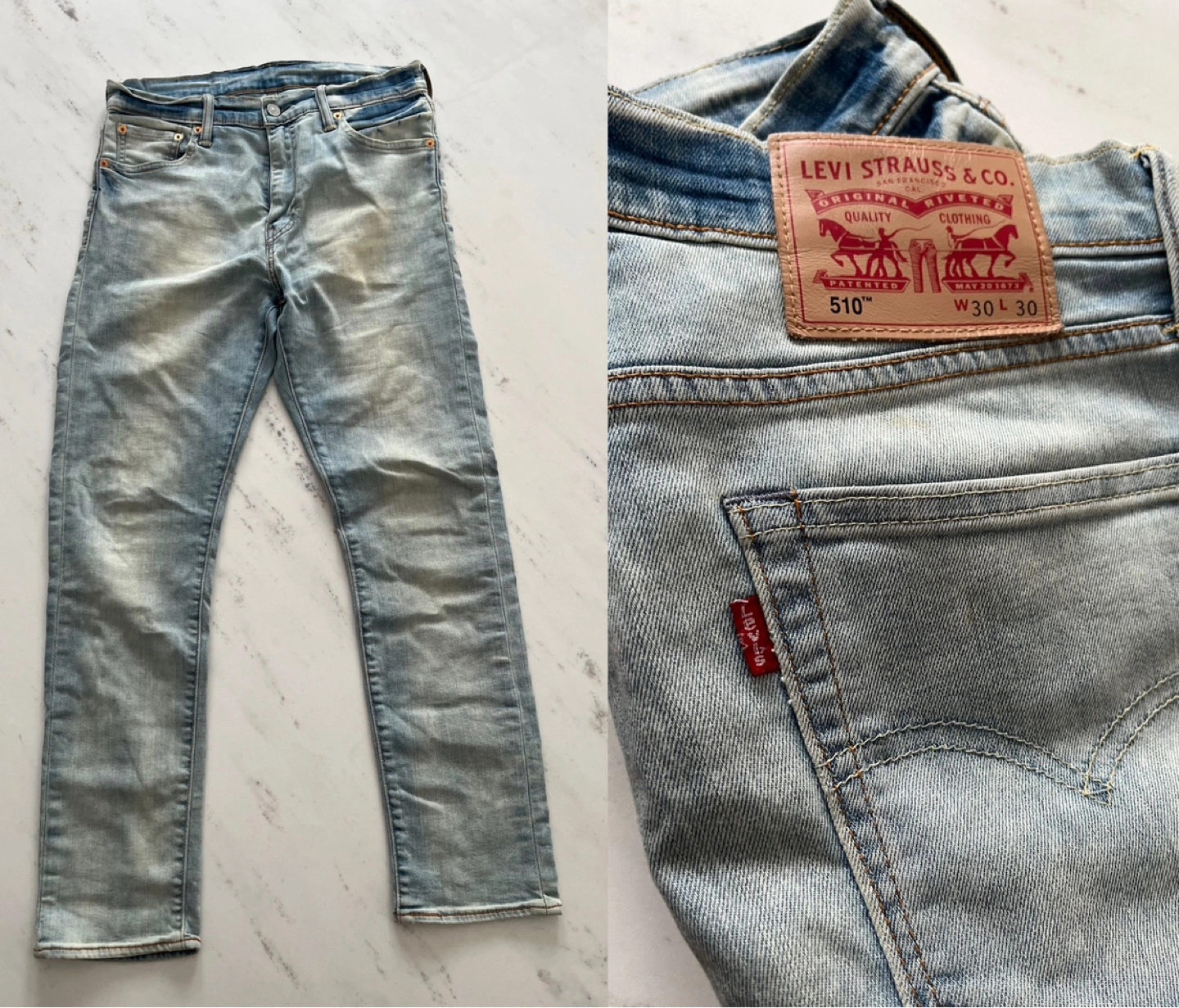 Brand: Levi’s (6x pairs), Club Monaco (2x pairs). Close up pictures included beside each pair to view material. Also includes 2x shorts (blue shorts Armani Exchange and pink shorts H&M). Sizes range from 28-31 but most are 30 waist. Length varies but ranges around 30-32.