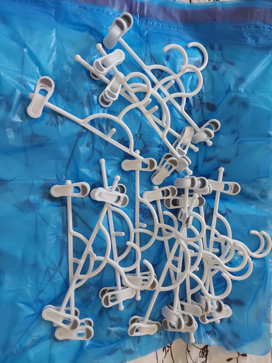 14 White Plastic Bottom (skirt/pant) Hangers. Bought them at dollarama. I've been downsizing my wardrobe/closet and no longer need these. If you can use them, please do.