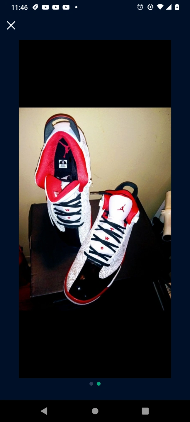 36Two pairs of Air Jordan One pair is predominantly black and red, the other is white, black and red. Both appear new in box. Prices Negotiable