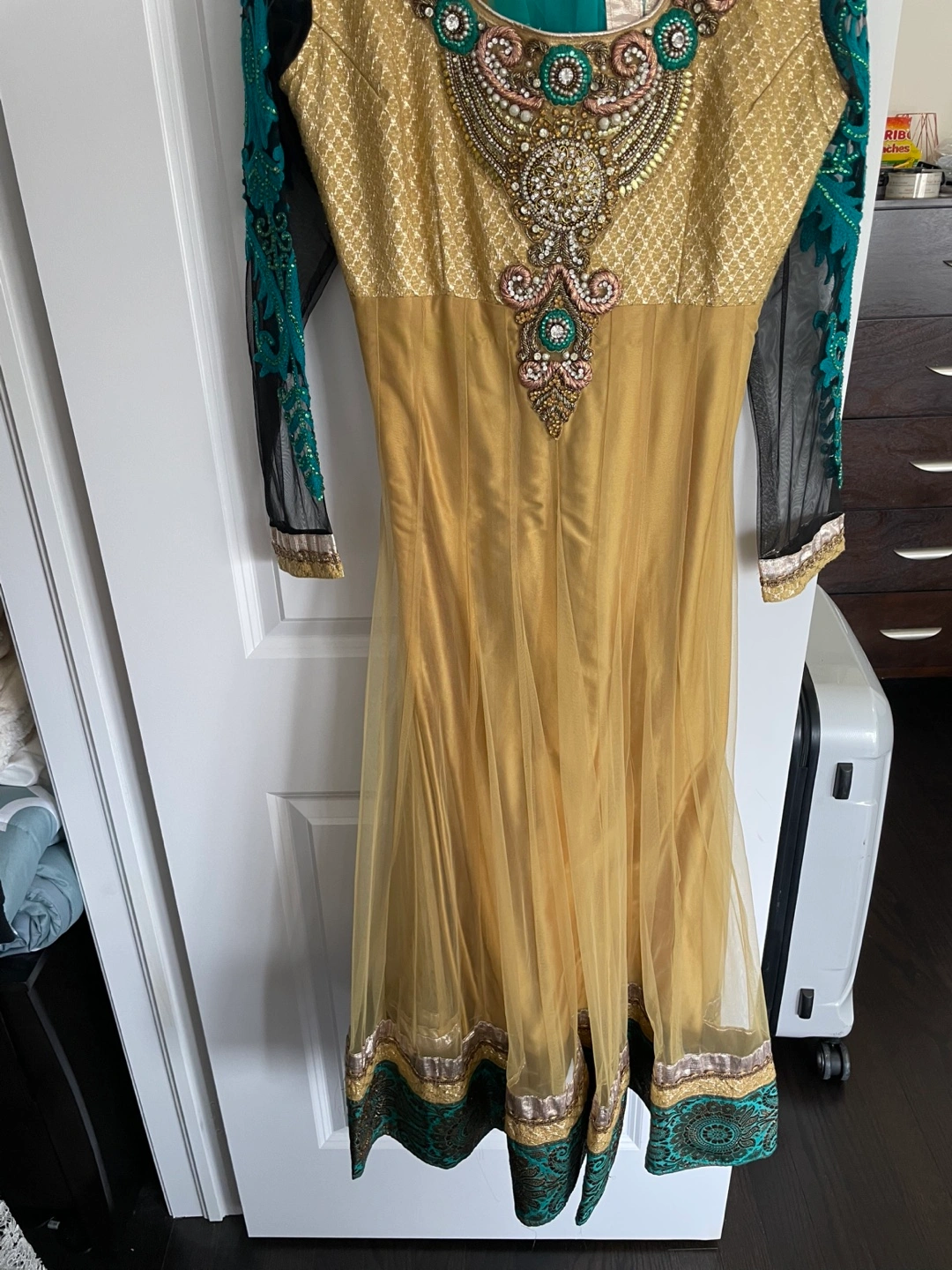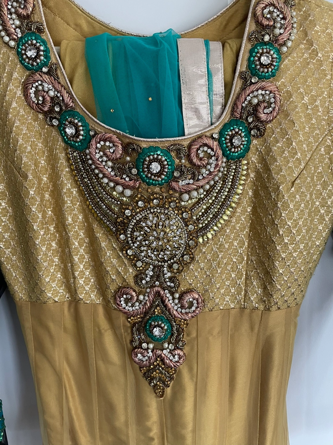 Beautiful gold and teal shalwar kameez. Intricate embroidery detail. Long sleeves. Includes matching dupatta.