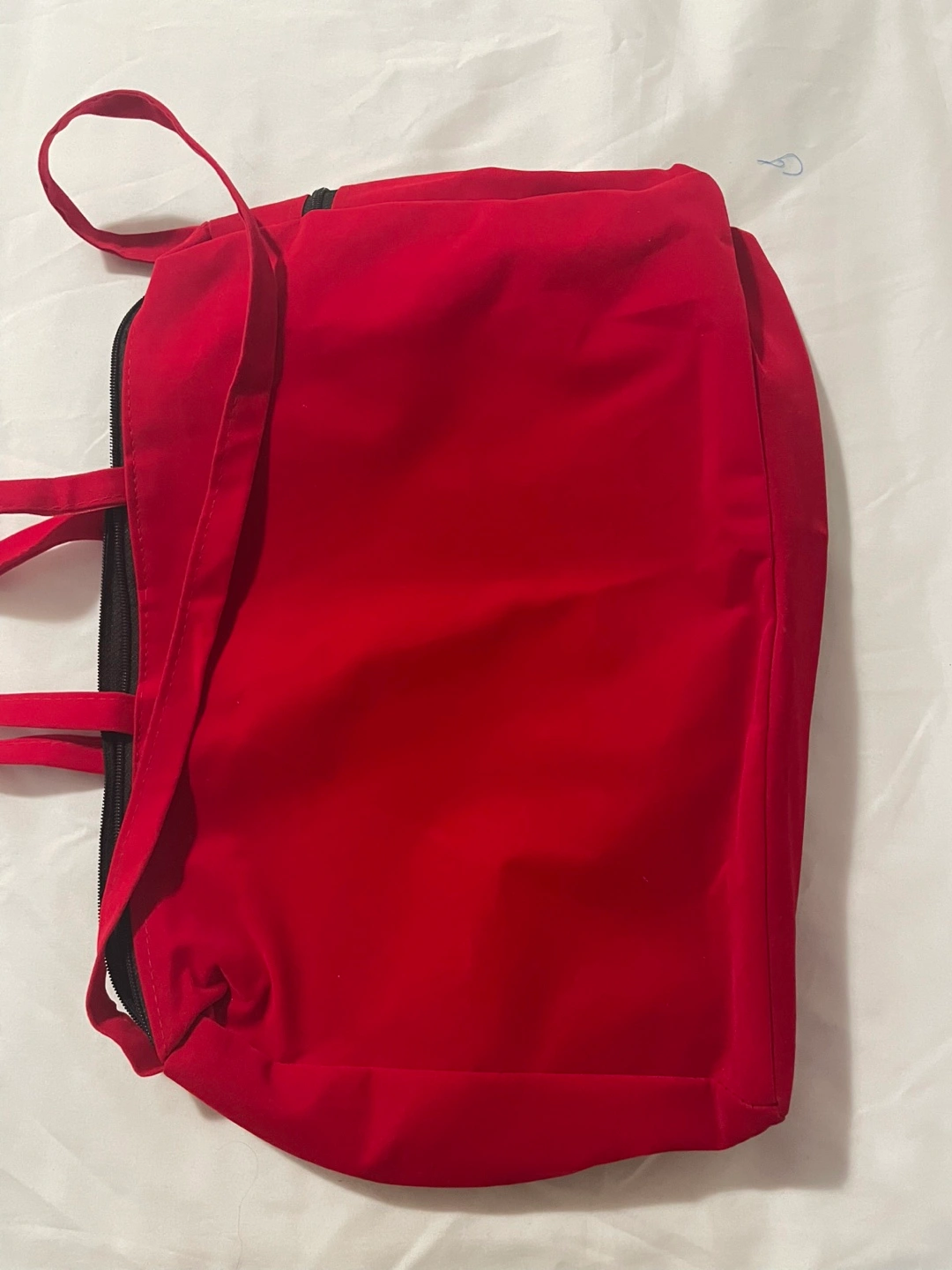 Large tote bag. Red and blue patterned fabric. Features embroidered stars and mirror accents. Top zip closure. Two top handles and a long shoulder strap.