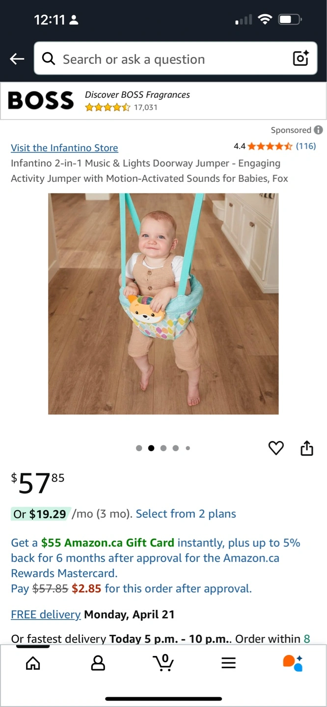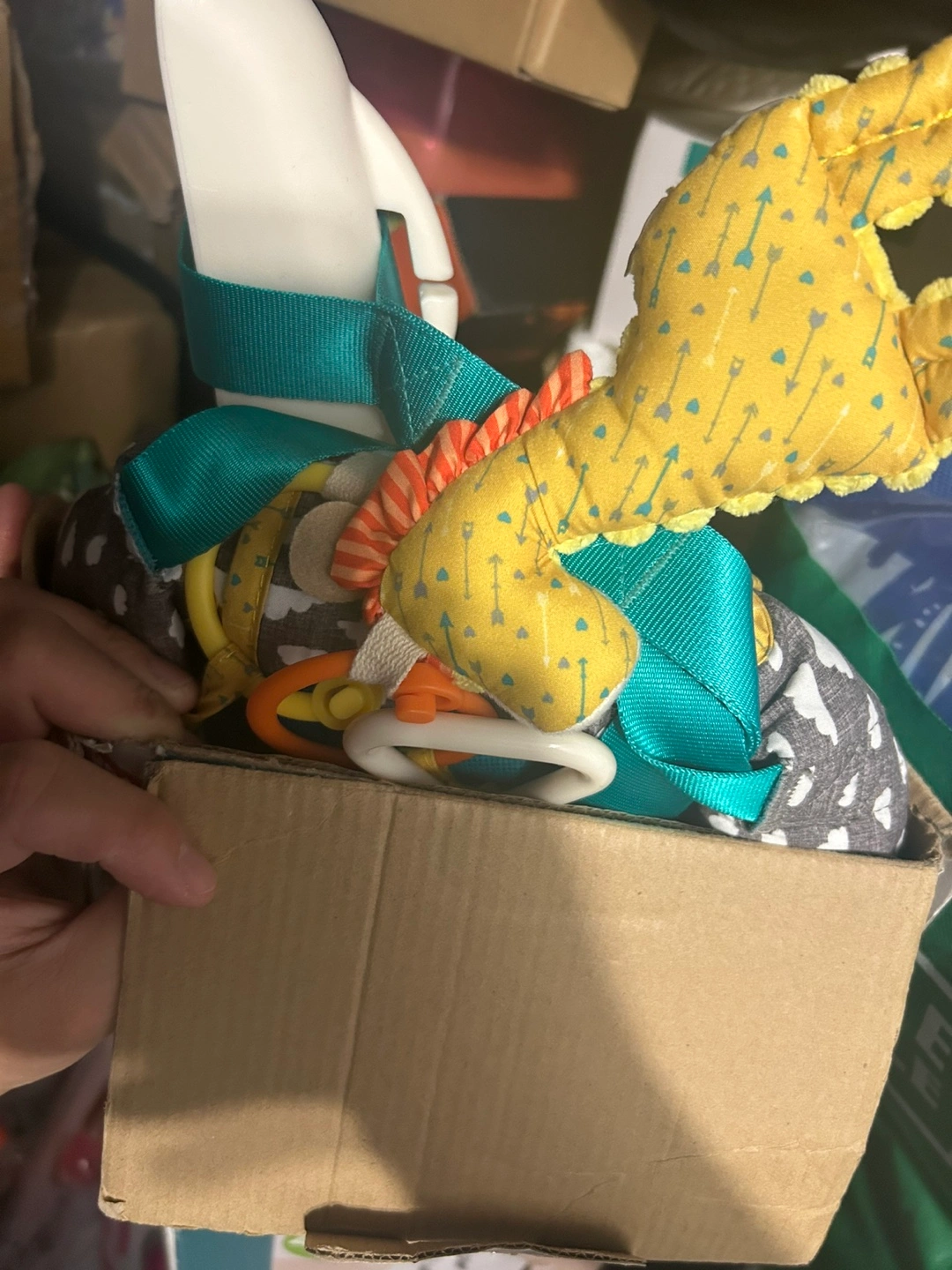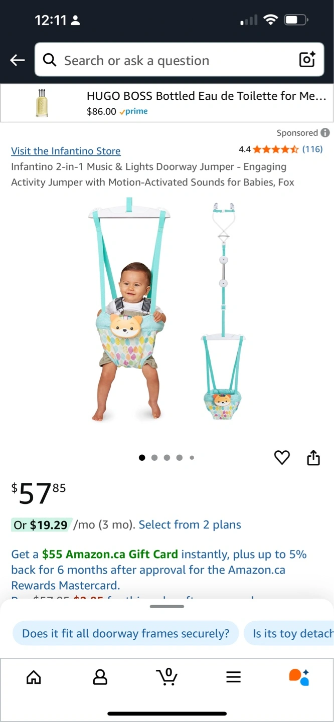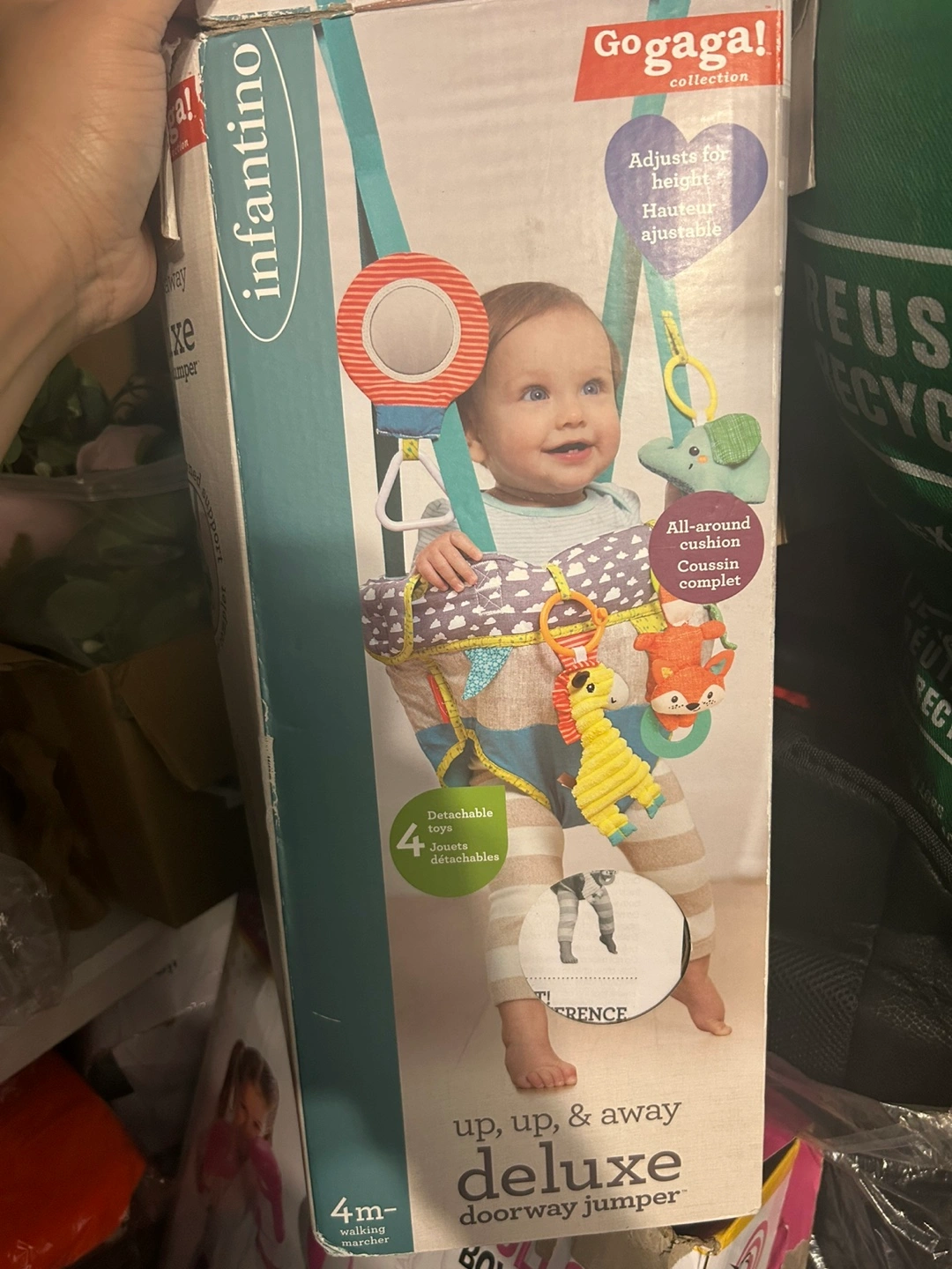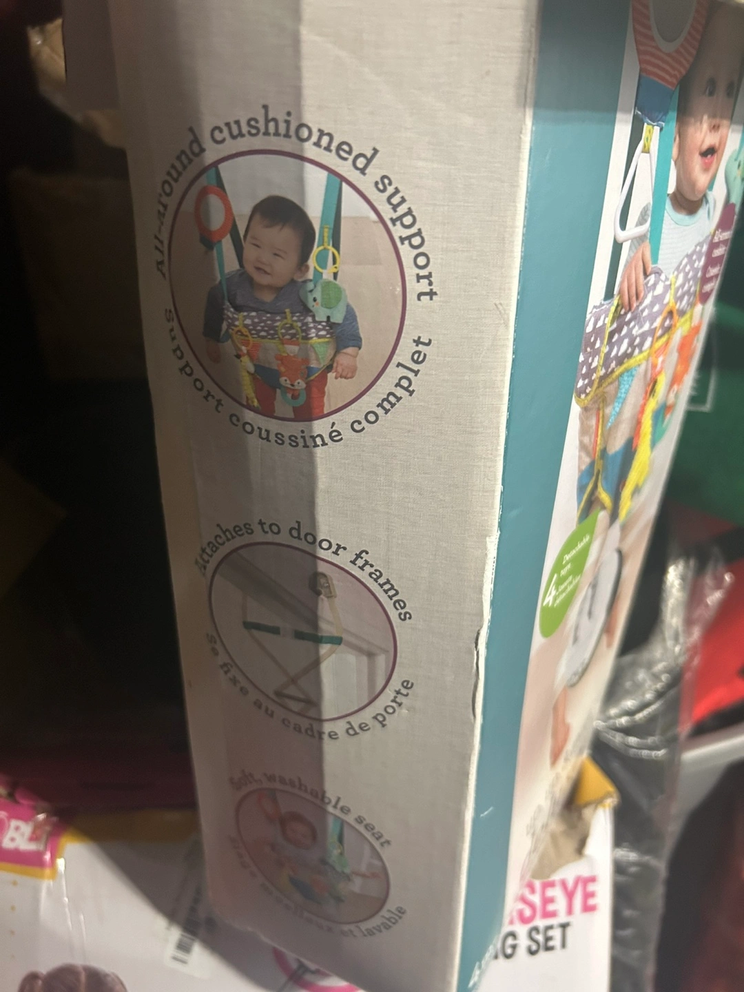 76Baby doorway jumper. Adjustable height. Features four detachable toys. All-around cushioned support. Machine-washable seat. Attaches to door frames.