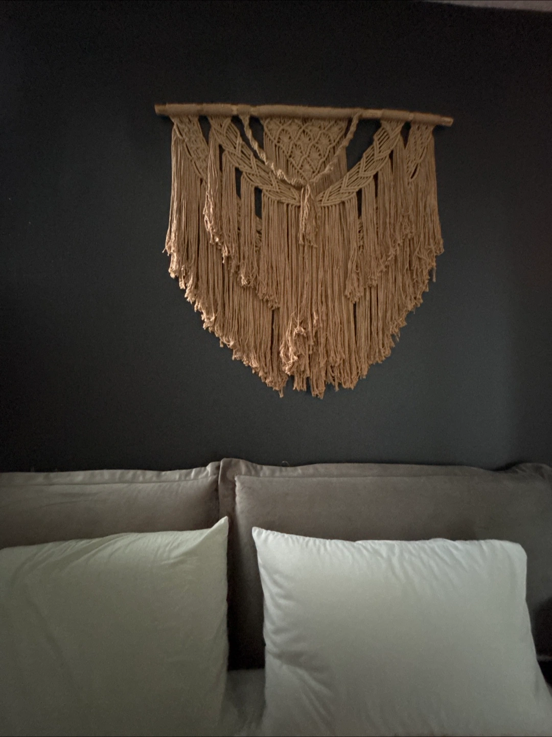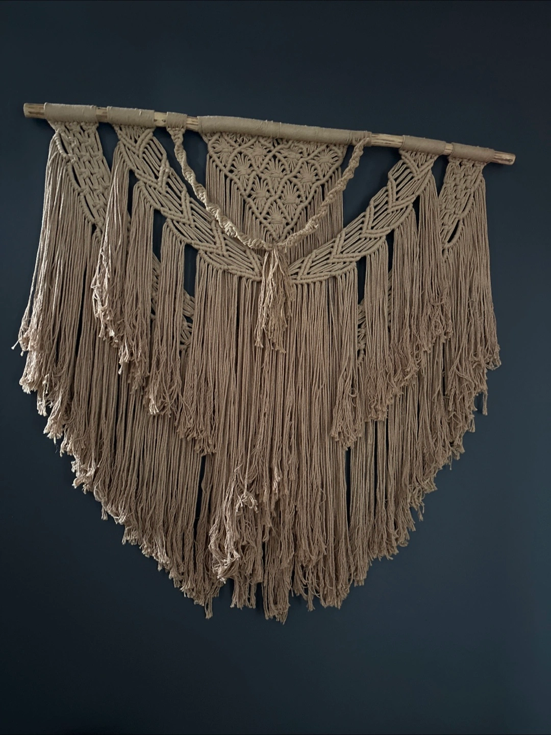 Boho Chic Beige macrame wall hanging. Bohemian style. Features a wooden dowel. Adds texture and visual interest ito any room.