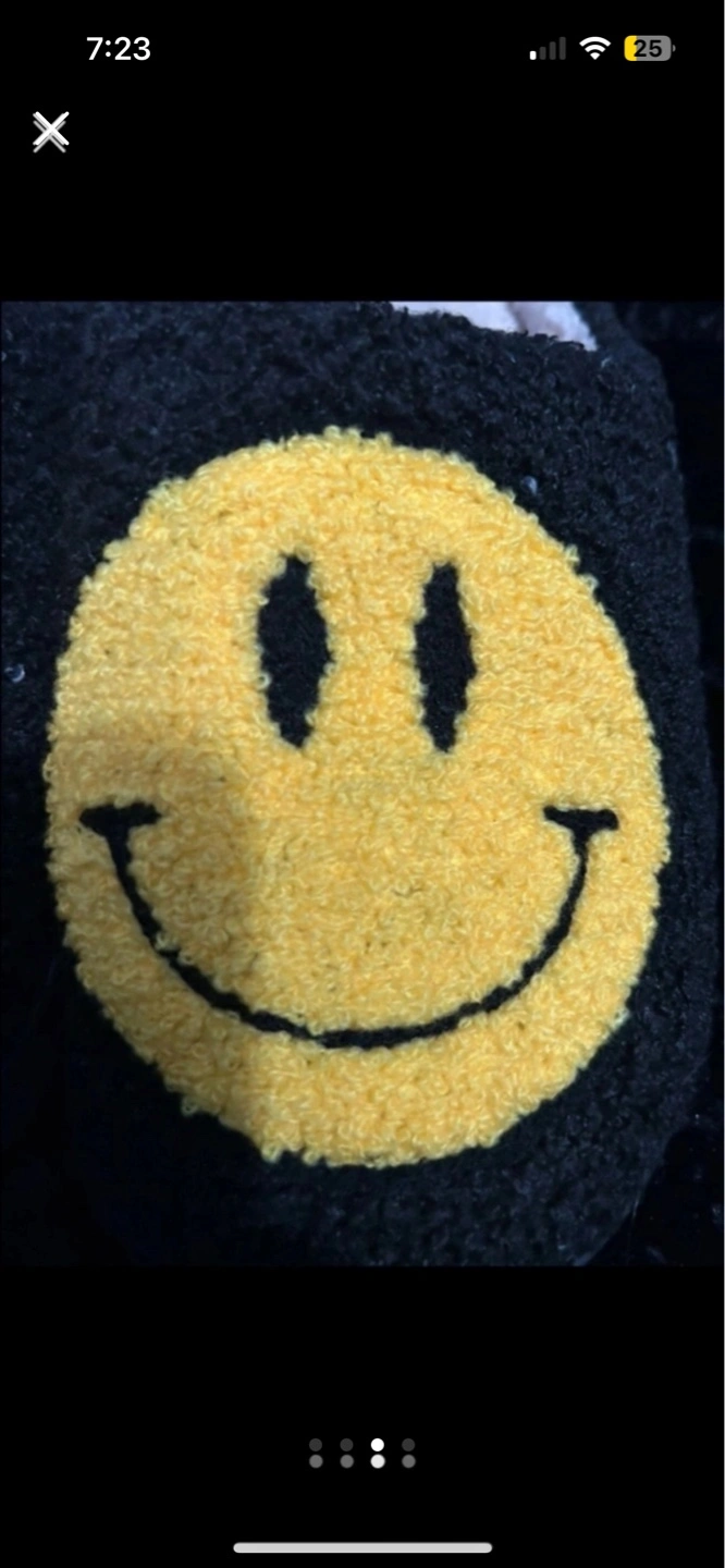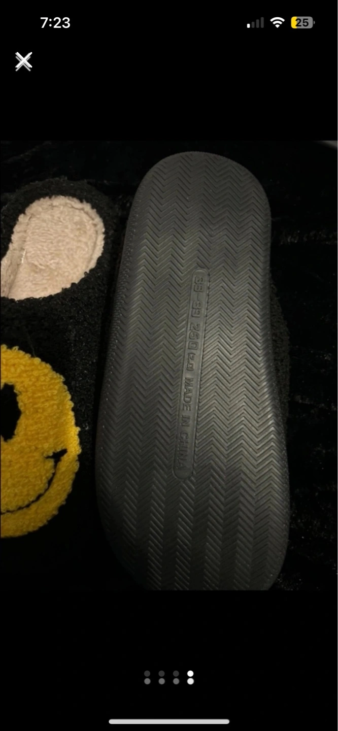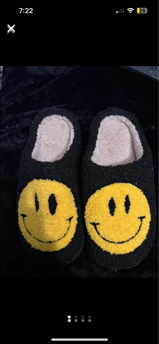 Black fuzzy slippers with yellow smiley faces. Soft interior. Good for lounging.