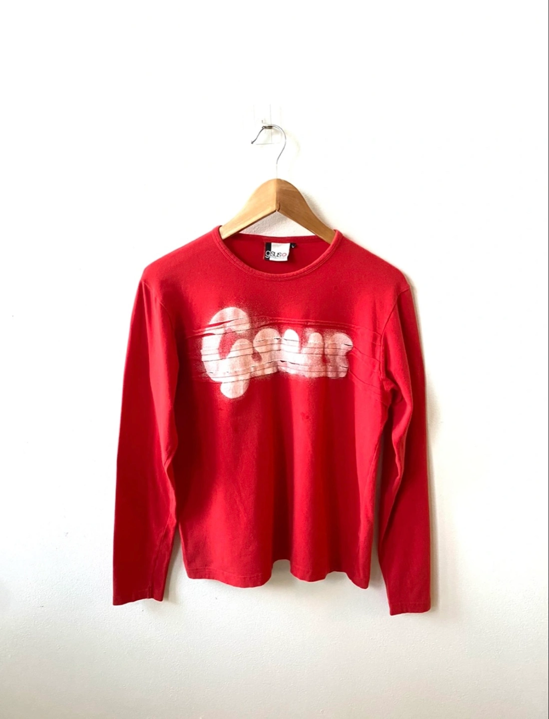 Long-sleeved red shirt. Features a graphic print on the front. Simple, casual style, 92%cotton. Good for layering or wearing on its own.