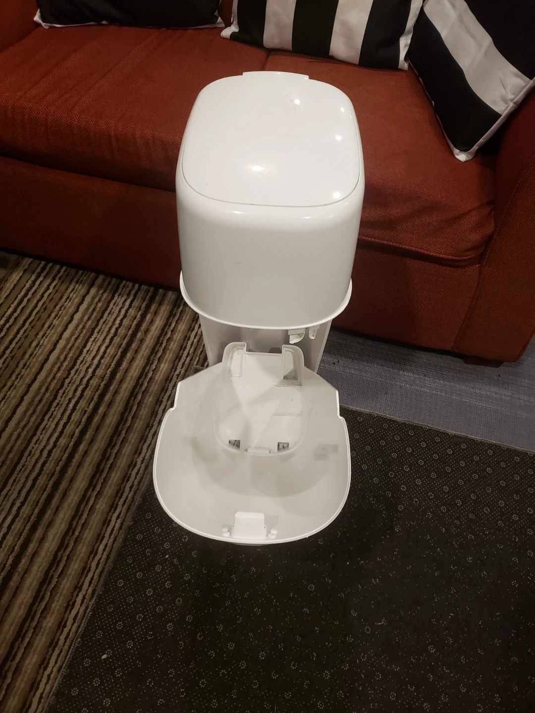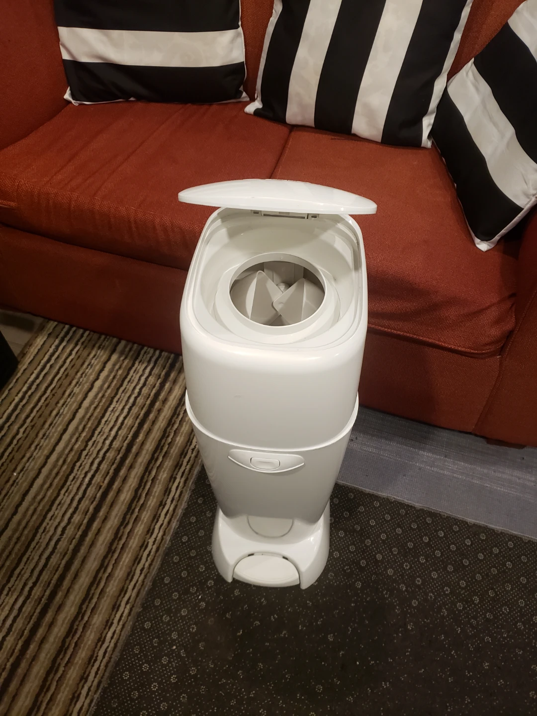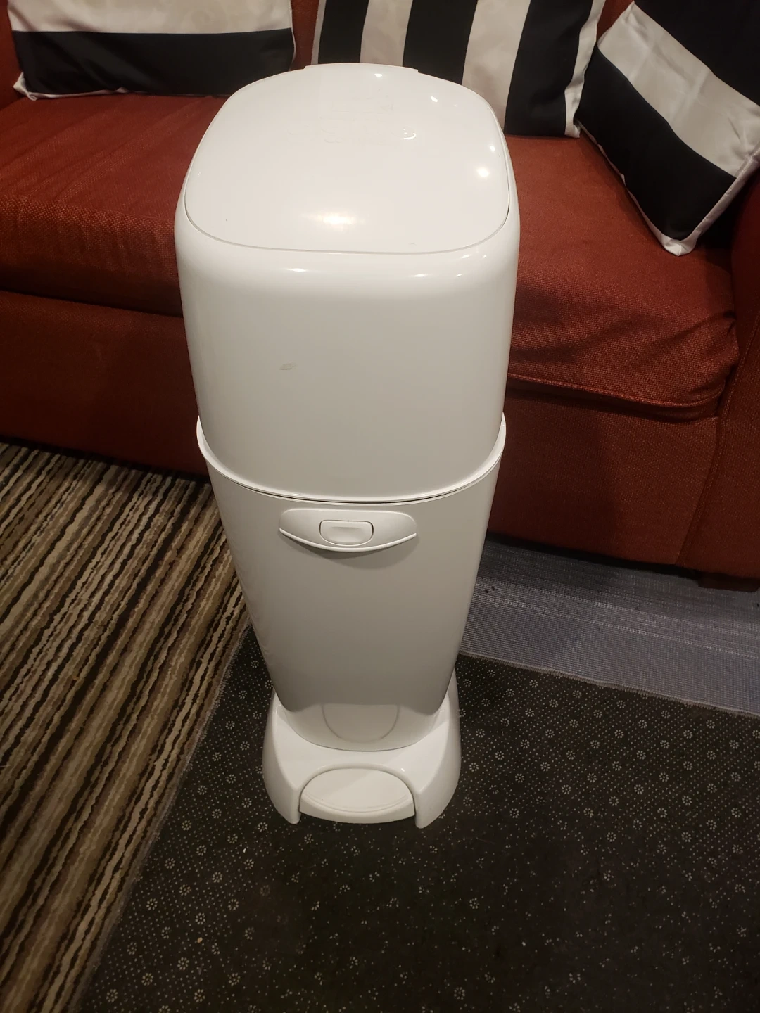 White diaper pail. Foot pedal operation. Refills sold separately. Pre-owned, some minor cosmetic wear. Pickup at Jane and Sheppard