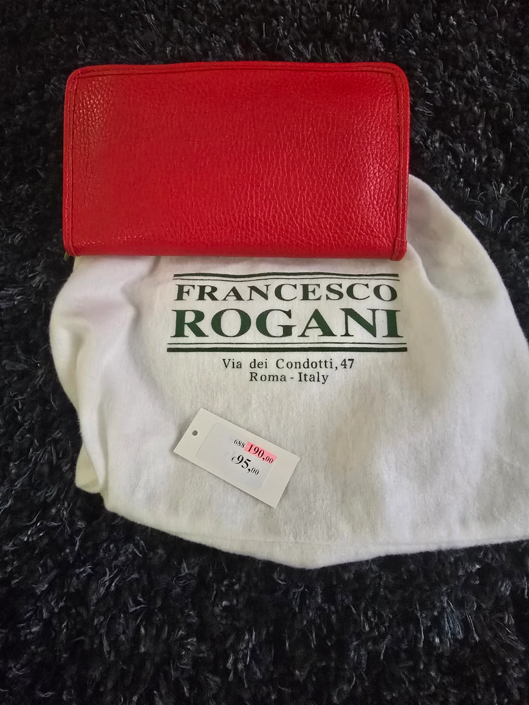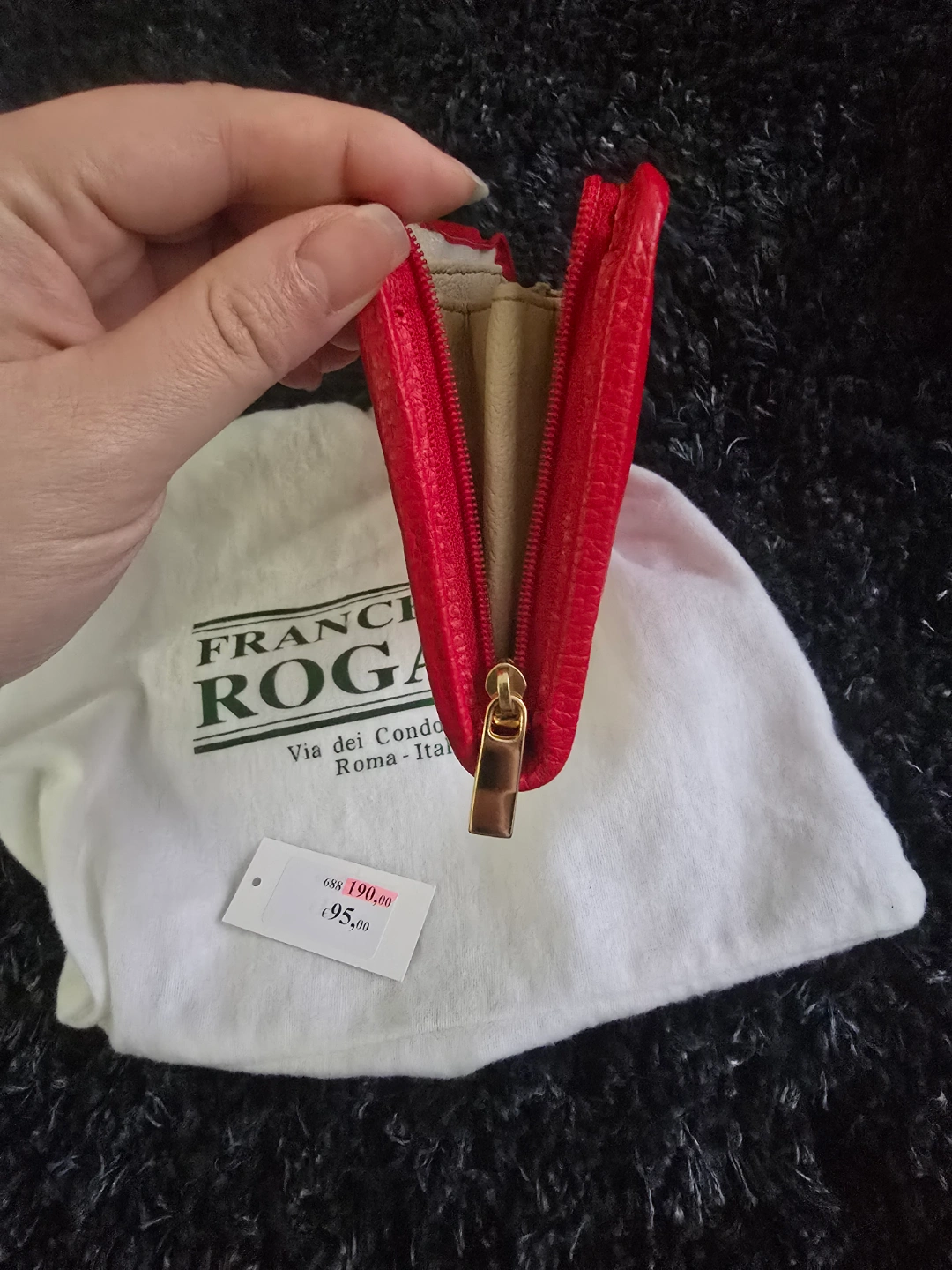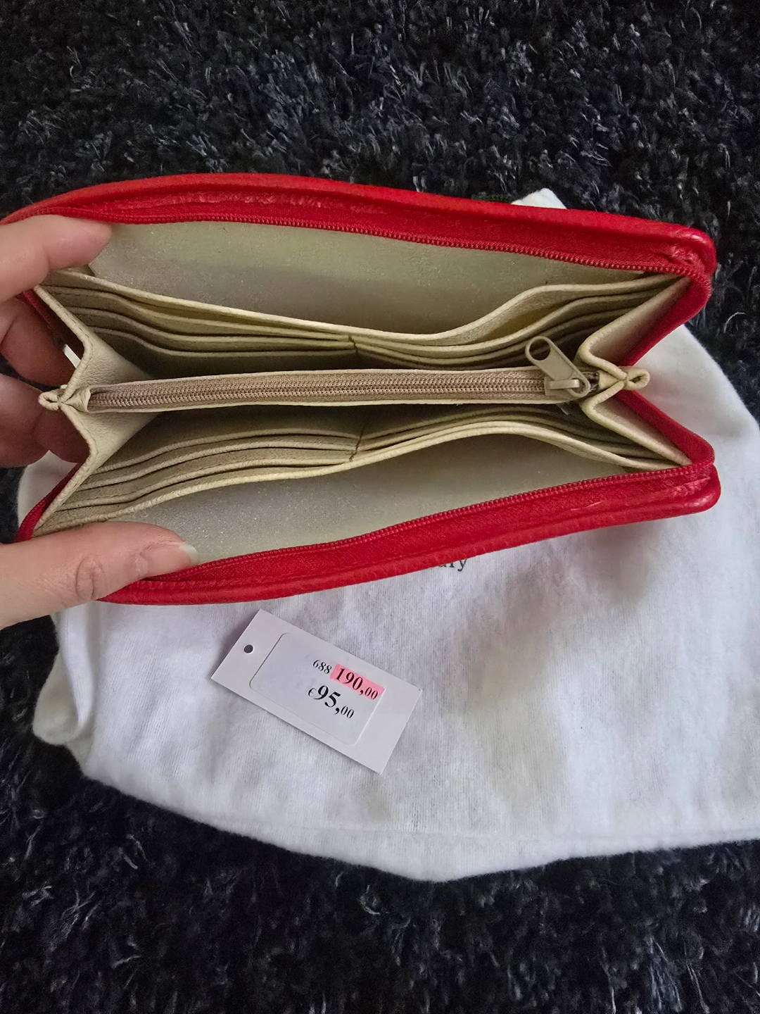 Red leather zip-around wallet. Multiple card slots and compartments. Gold-toned zipper. Comes with dust bag. Looks new.