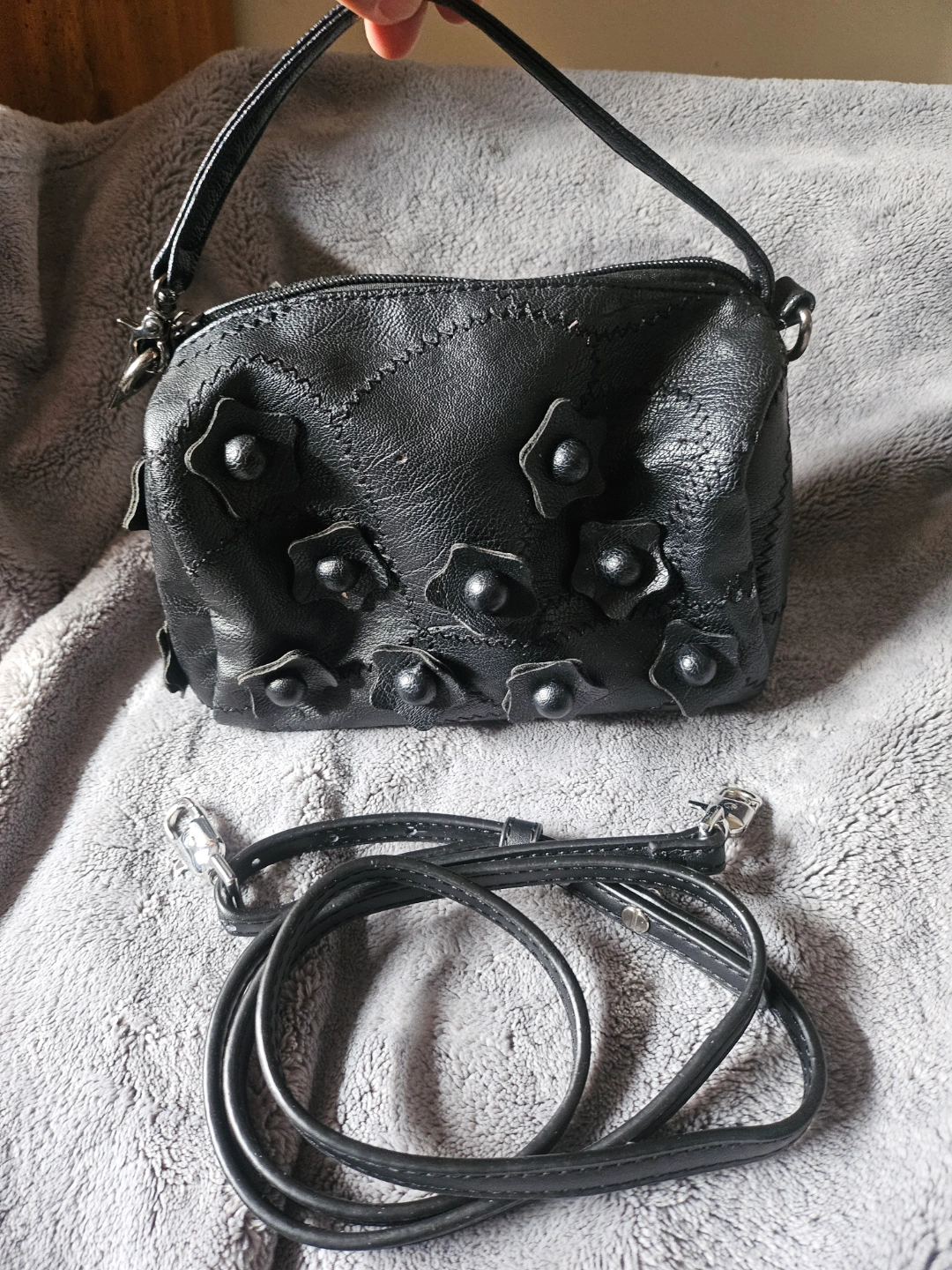Small black handbag. Features flower accents. Includes a detachable shoulder strap. Zipper closure. Unique design.