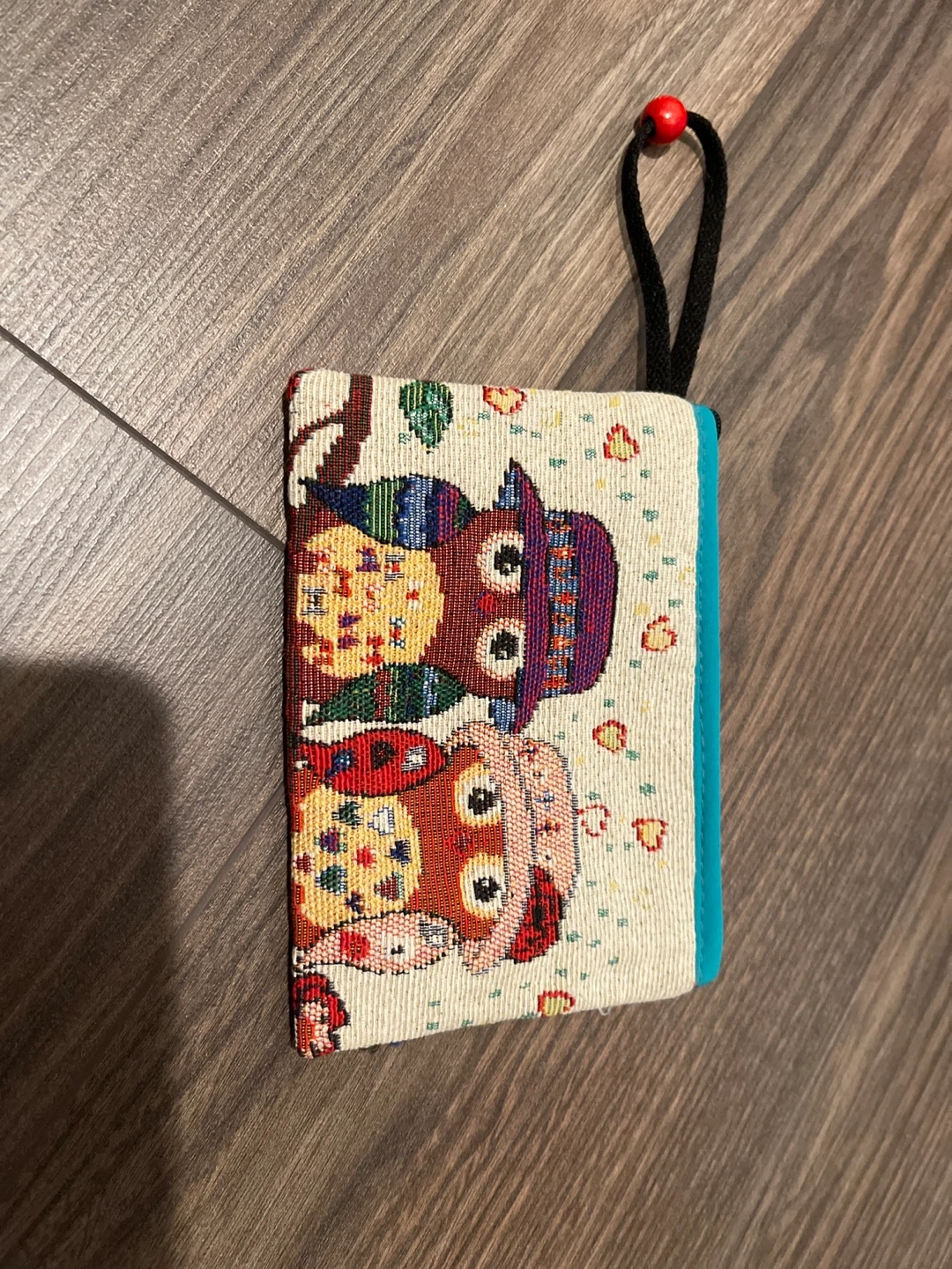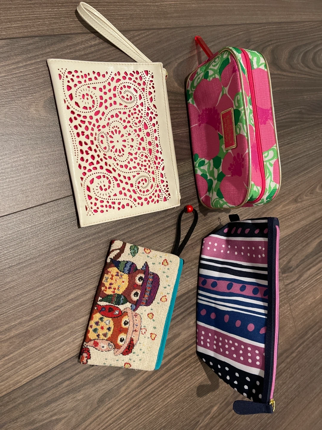 Set of four cosmetic pouches / bags. Various colours and patterns. One is floral, one is a striped pattern, one has 2 owls, and one is a cutout design. Great for travel or organizing.