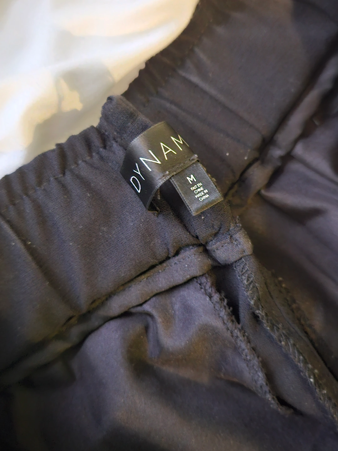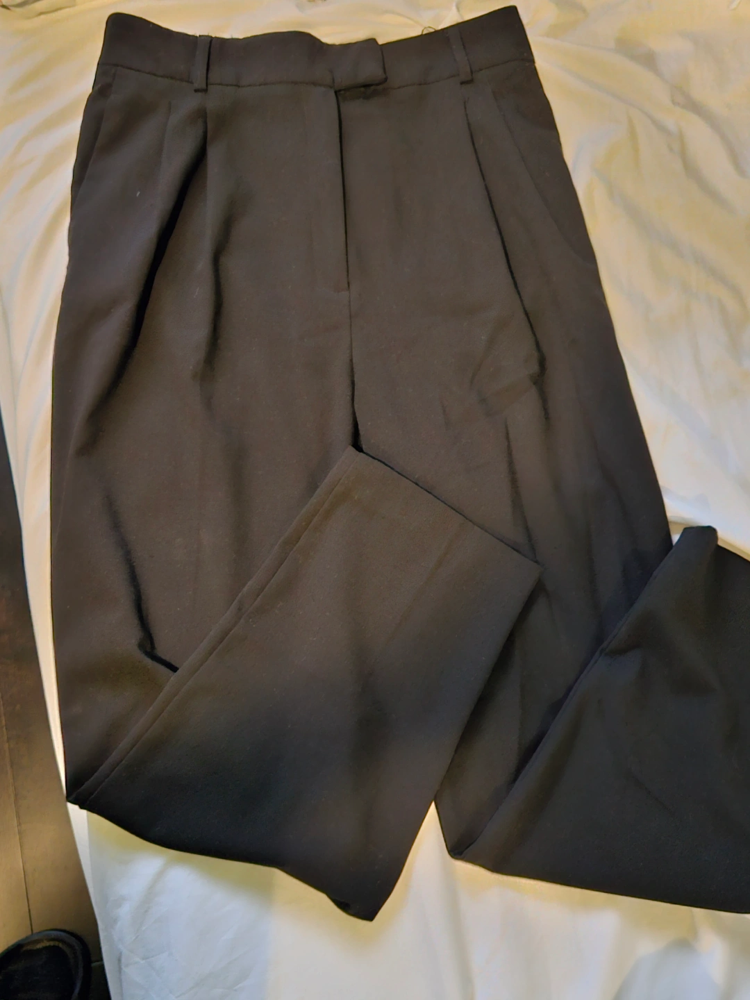 Black ankle-length pants. Medium size. Elastic waistband which was tailored. Pleated front. Side pockets.