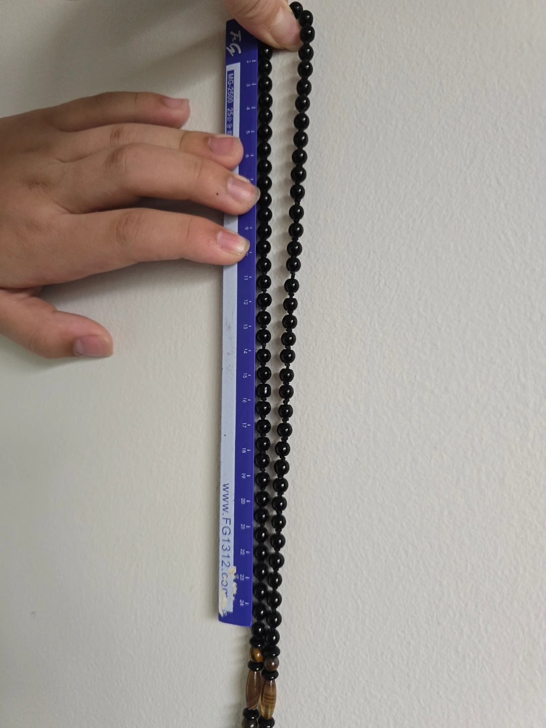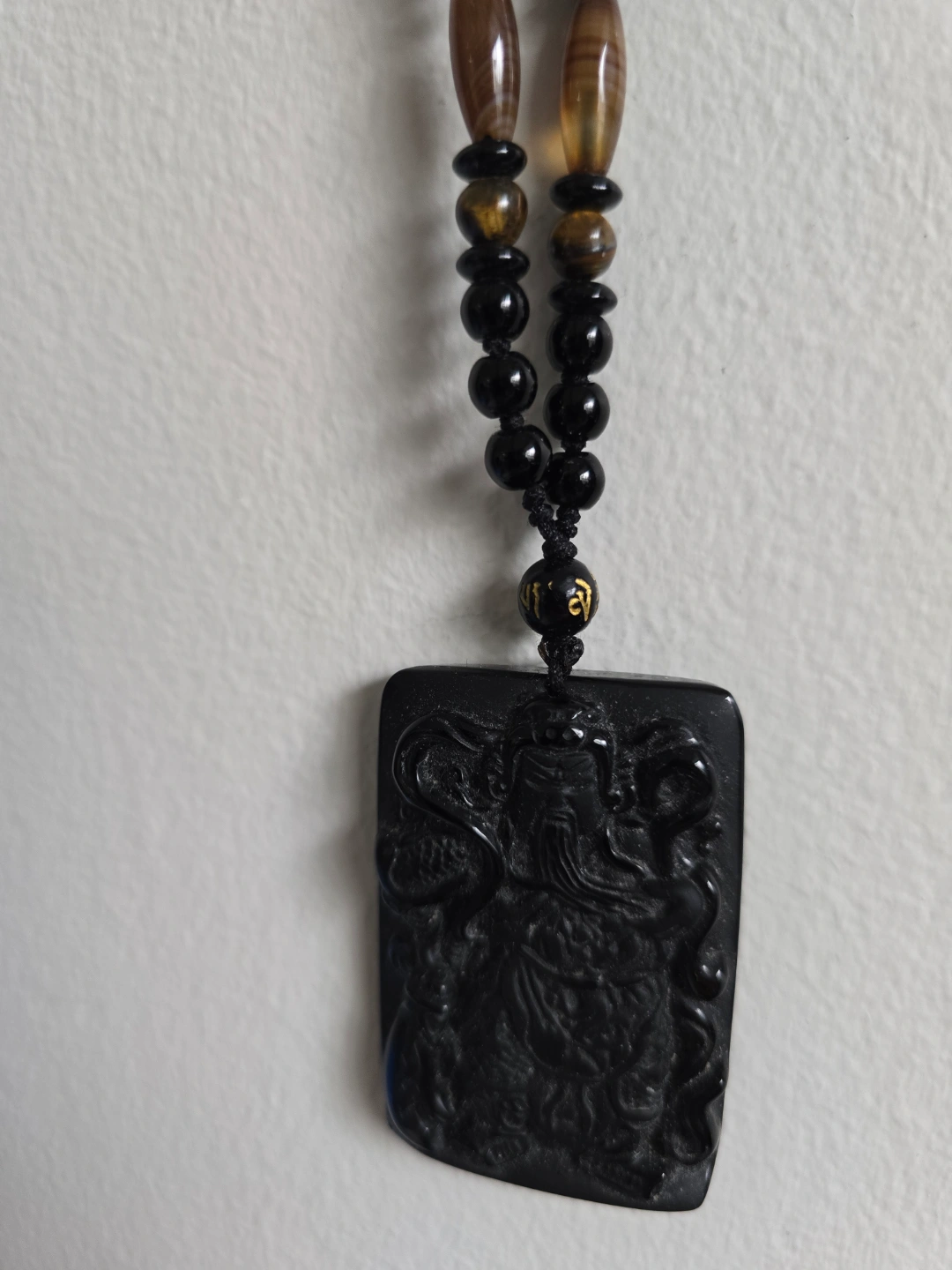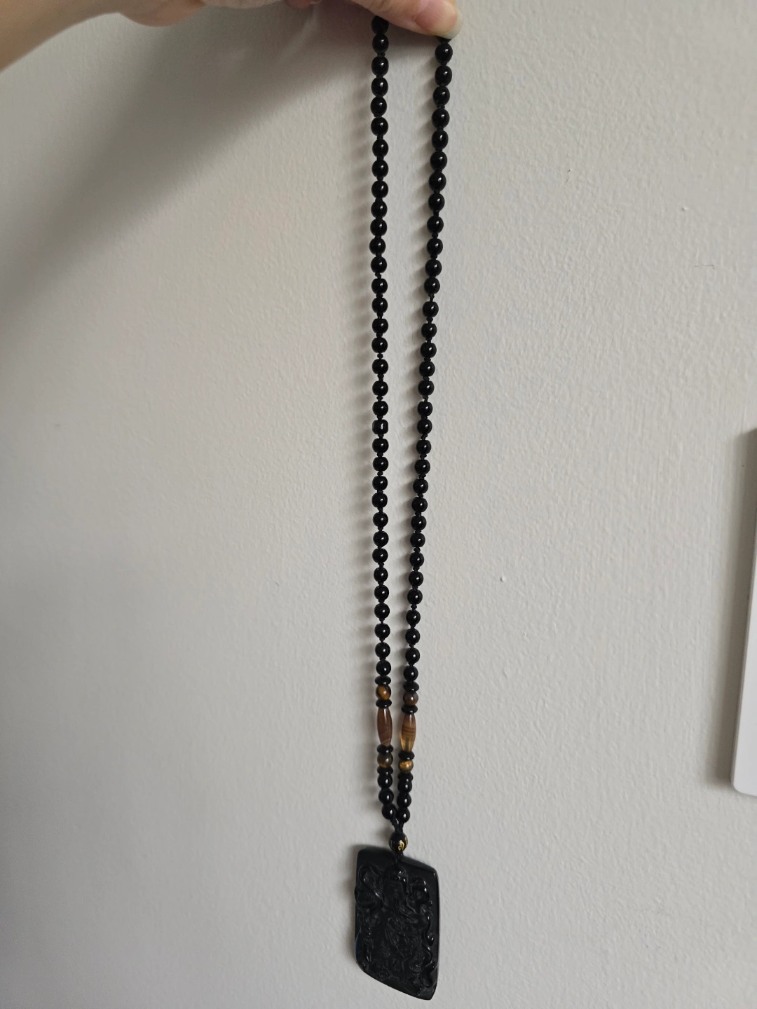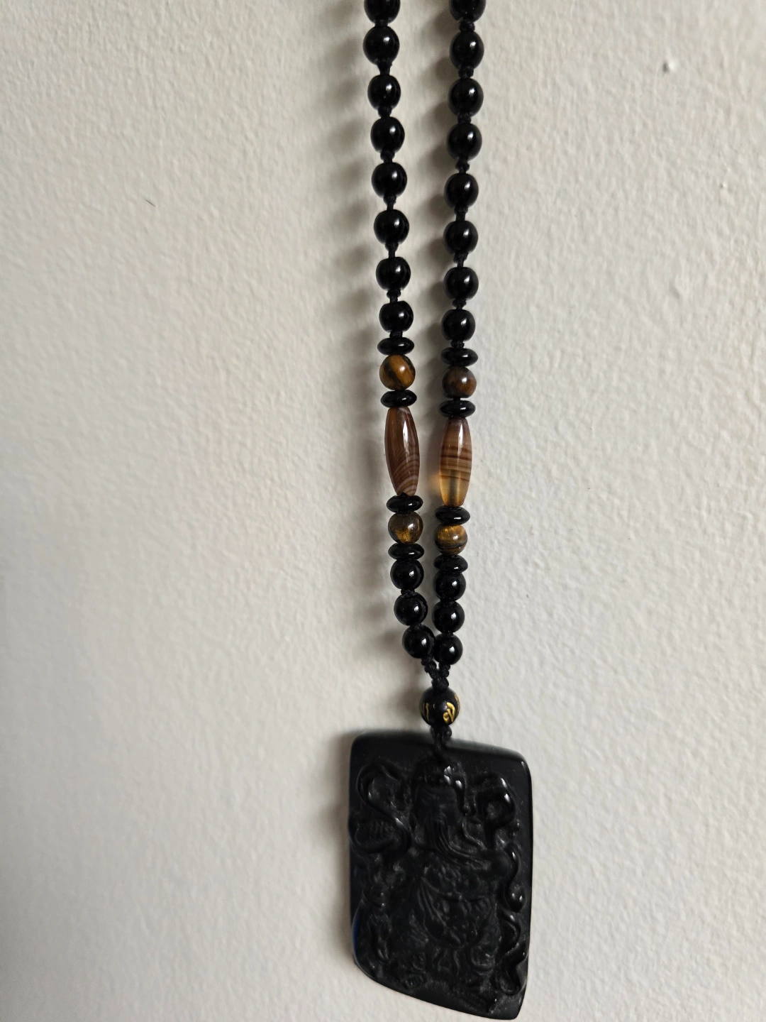 72Intricate black obsidian pendant, rectangular shape. Features detailed carving. Black beaded necklace, tiger eye accents. Approximately 26 cm long and another 5cm for pendant
