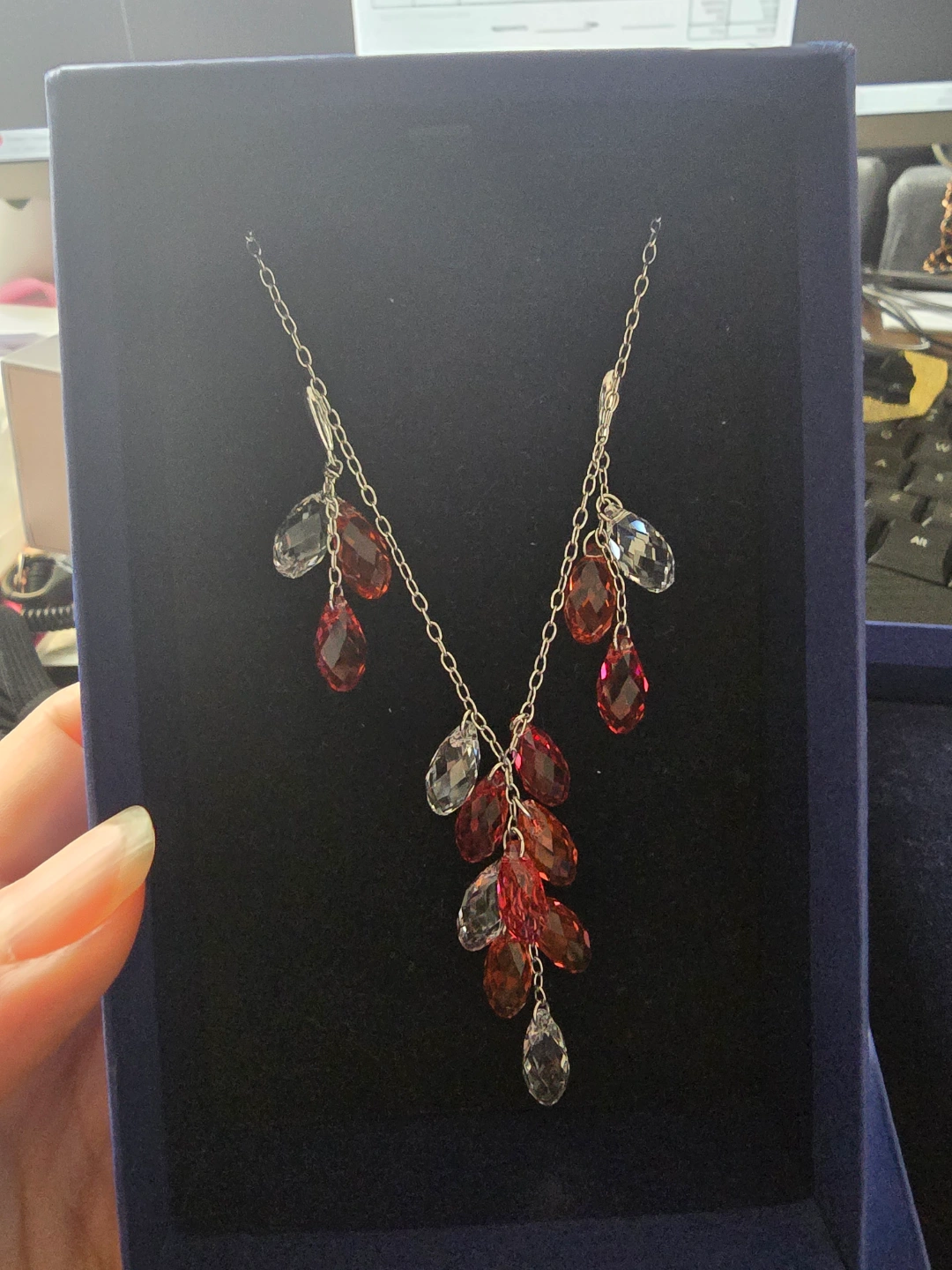 72Beautiful Swarovski necklace and earring set. Features red and clear crystals. Comes in original box with certificate. Elegant and eye-catching.