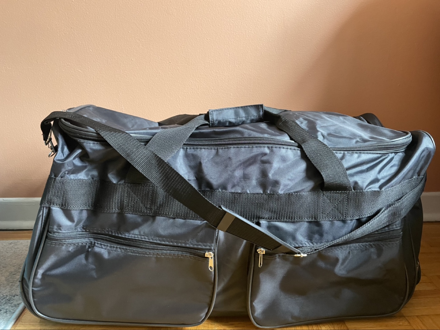 Spacious black duffle bag with wheels and a retractable handle. Multiple pockets and compartments. Ideal for travel or sports equipment. Durable fabric construction. Never used. 28x13x13 approximately.