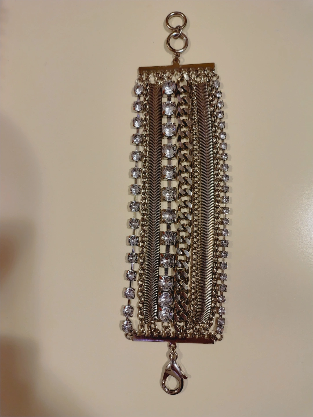 27Gorgeous statement bracelet. Features multiple chains and sparkling rhinestones. Silver-toned metal. Lobster clasp closure.