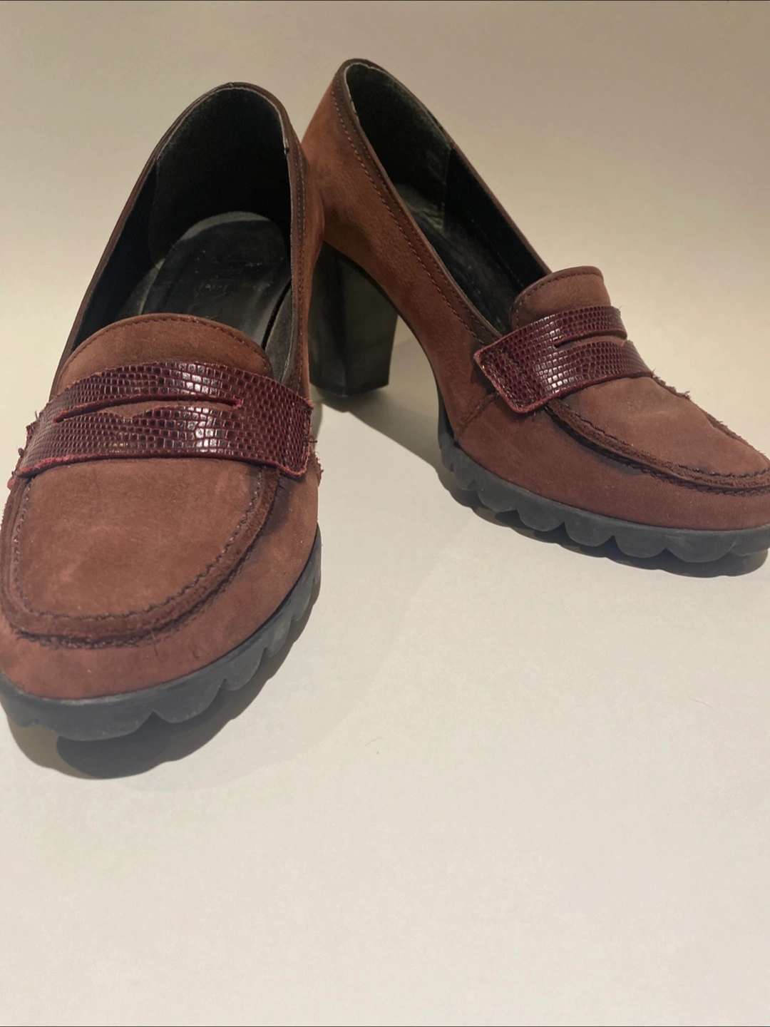 Burgundy suede women's loafers. Features a burgundy snakeskin-like detail. Block heel. Size US 7/EU 38. Some water spots, which could probably be fixed with a suede eraser.