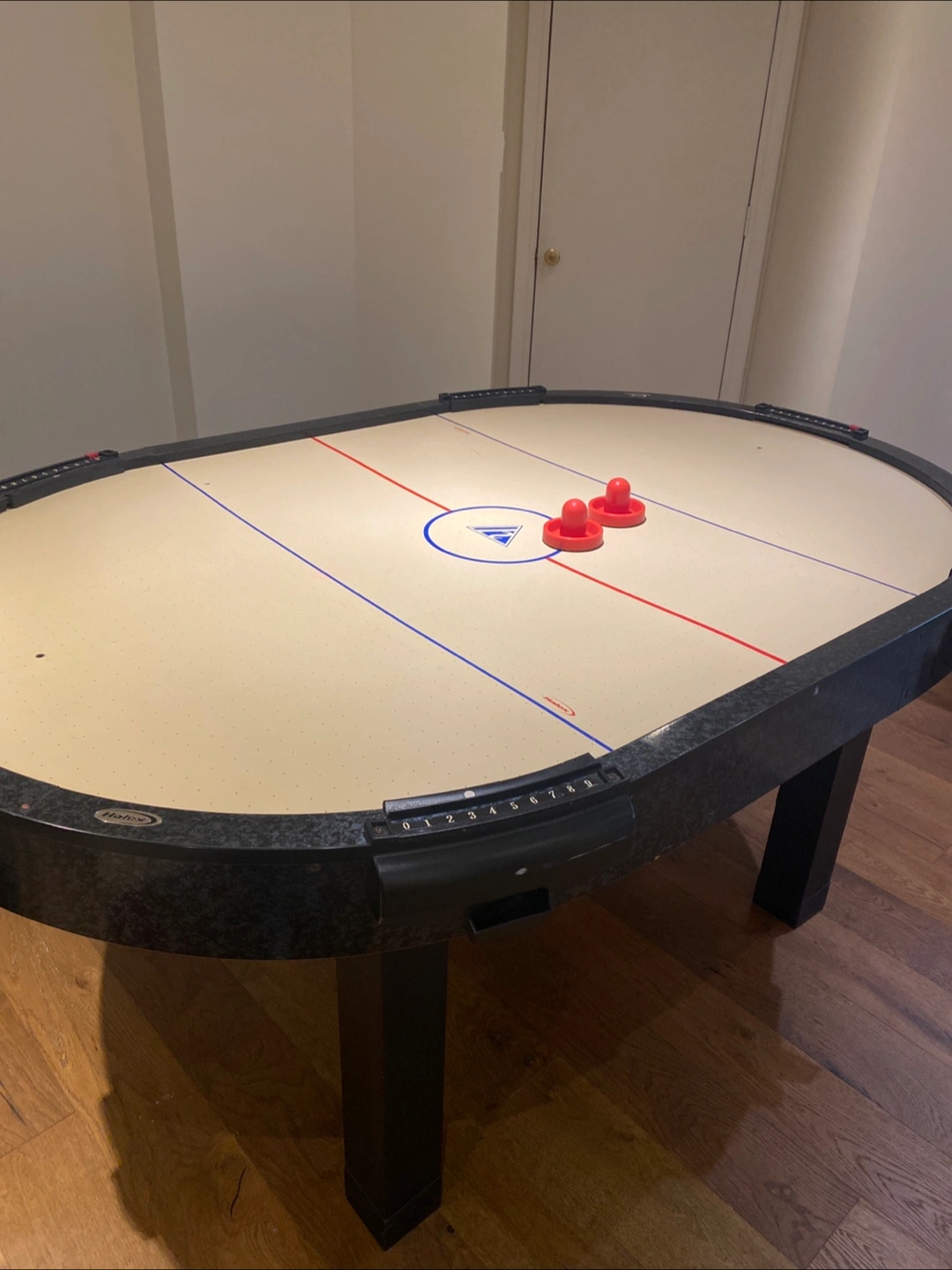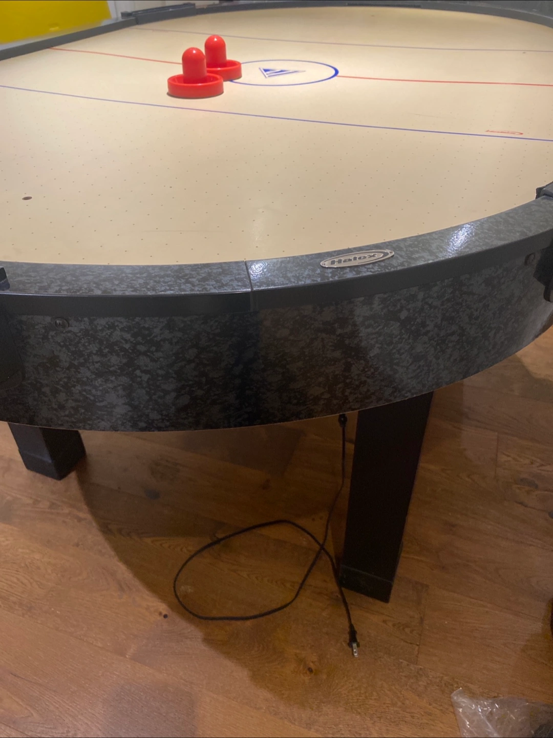 120Oval air hockey table. Black and grey speckled finish. Includes mallets and pucks. Good condition.