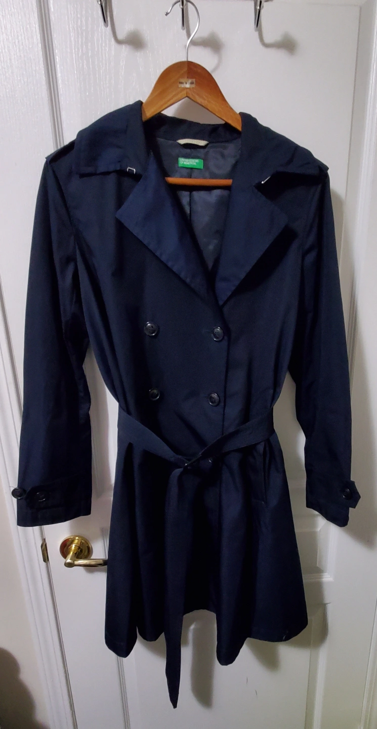 919United Colors of Benetton. Quality trench. Excellent condition. Infrequently worn. Navy Blue trench coat. Double-breasted. Belted waist. Long sleeves. Classic style.
