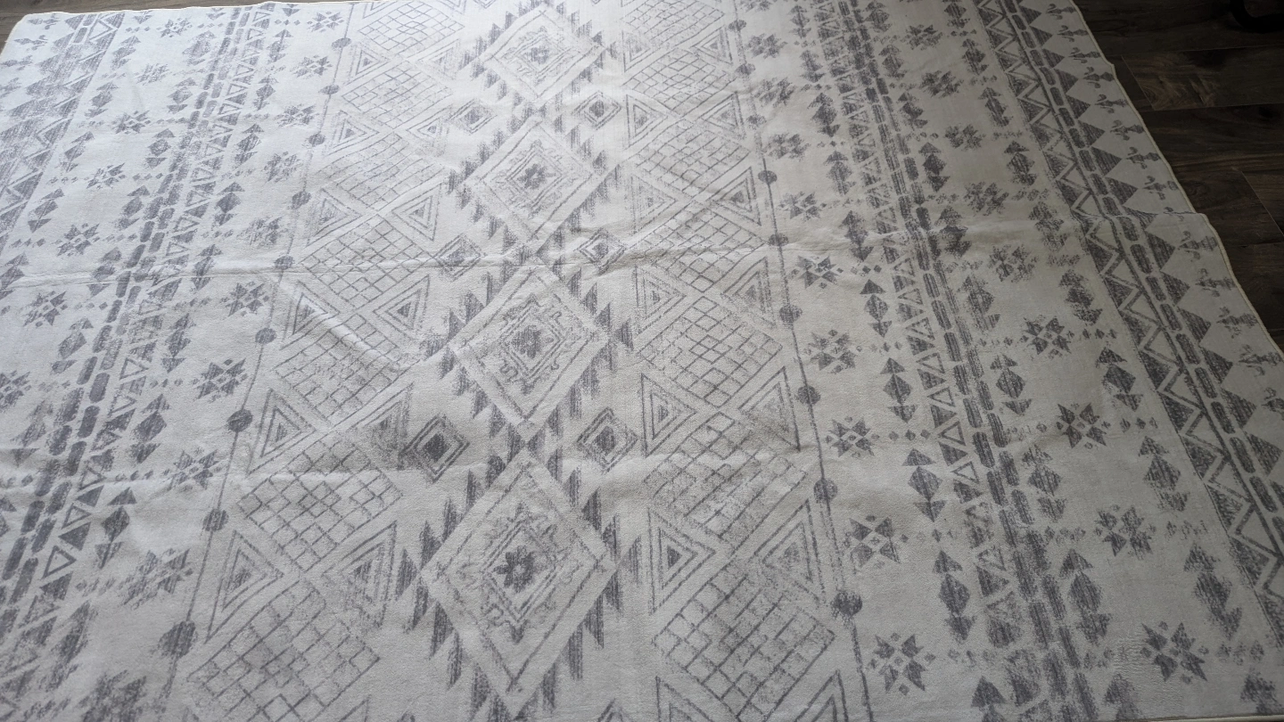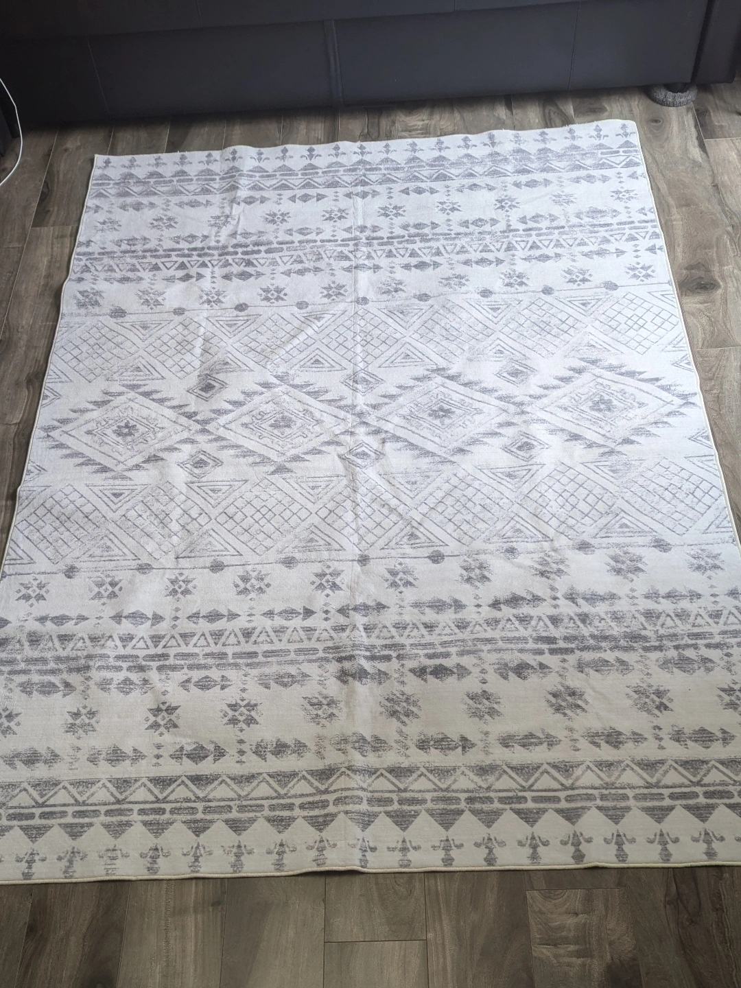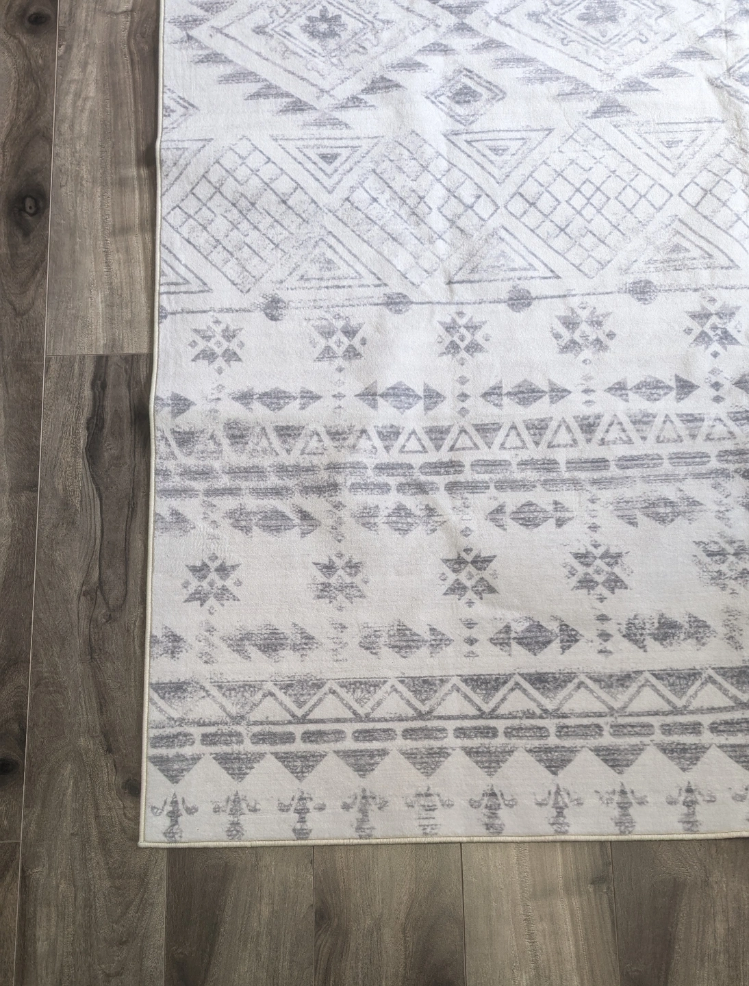 Large area rug. Off-white base with a grey geometric pattern. Suitable for living room or bedroom. Machine washable.