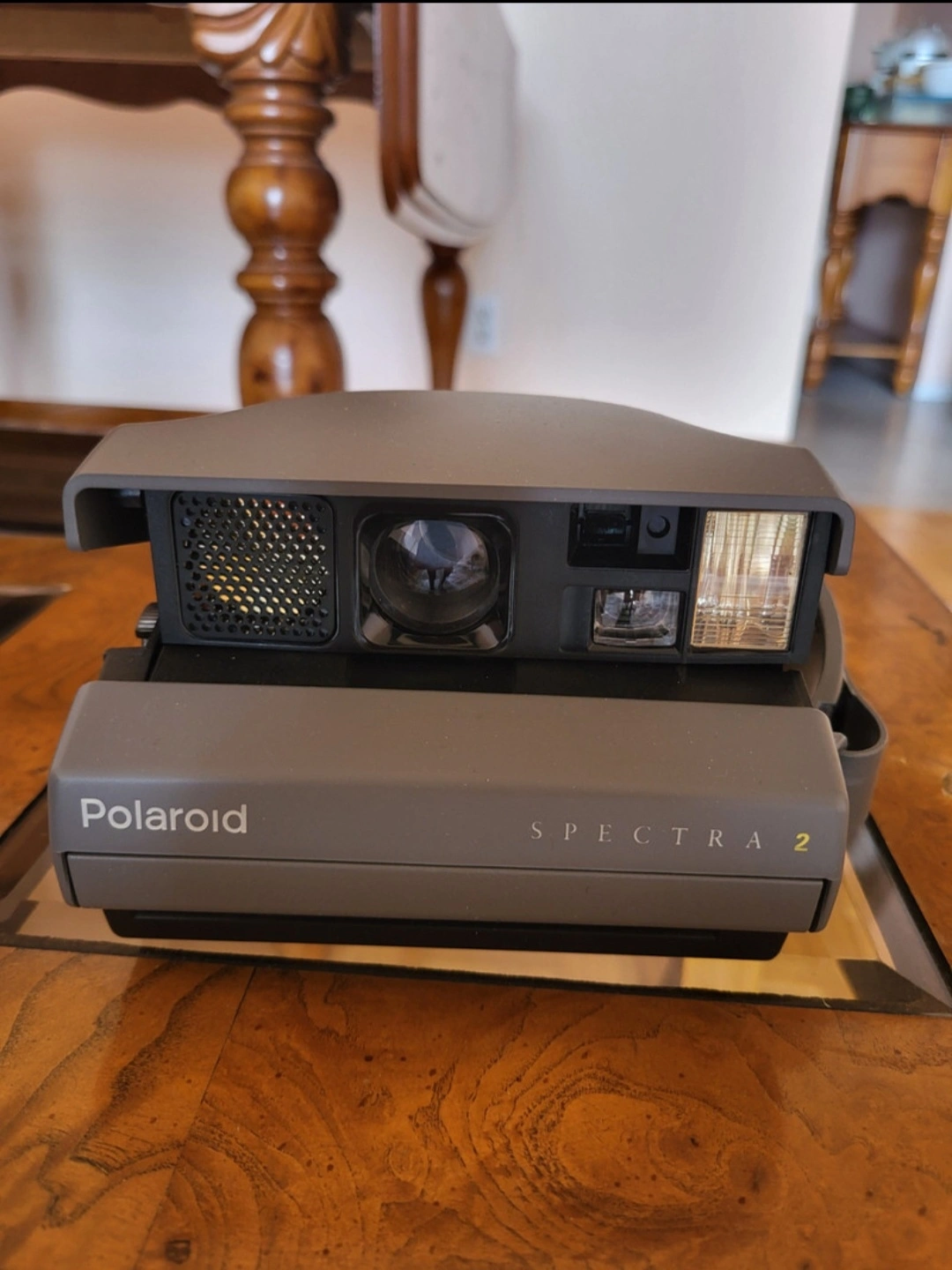 Grey Polaroid Spectra 2 instant camera. Includes built-in flash. Great for instant photography enthusiasts.