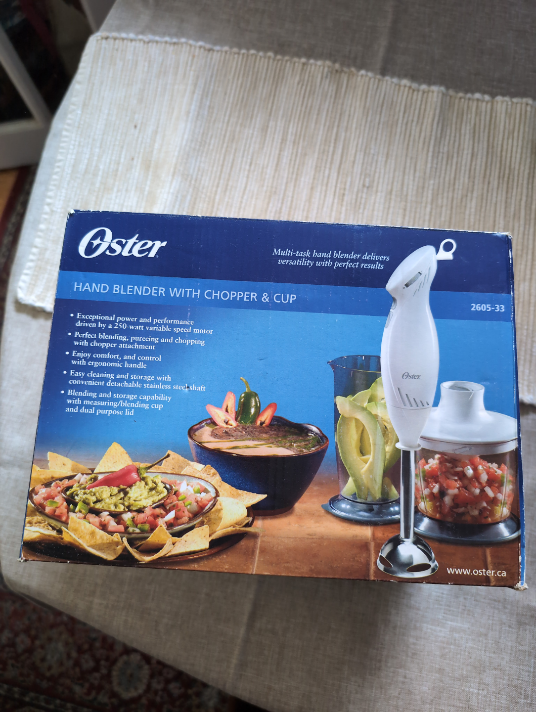 Multi-task hand blender. 250-watt variable speed motor. Includes chopper attachment, ergonomic handle, and measuring/blending cup with dual purpose lid. Easy cleaning and storage.