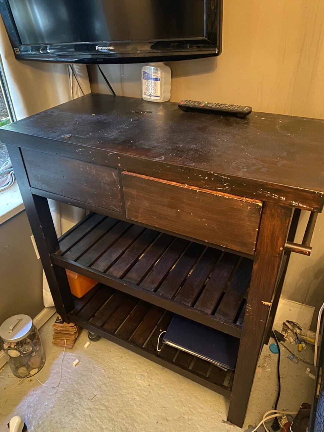 Used kitchen cart, dark brown wood finish.
