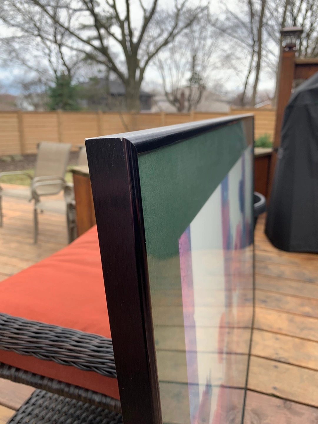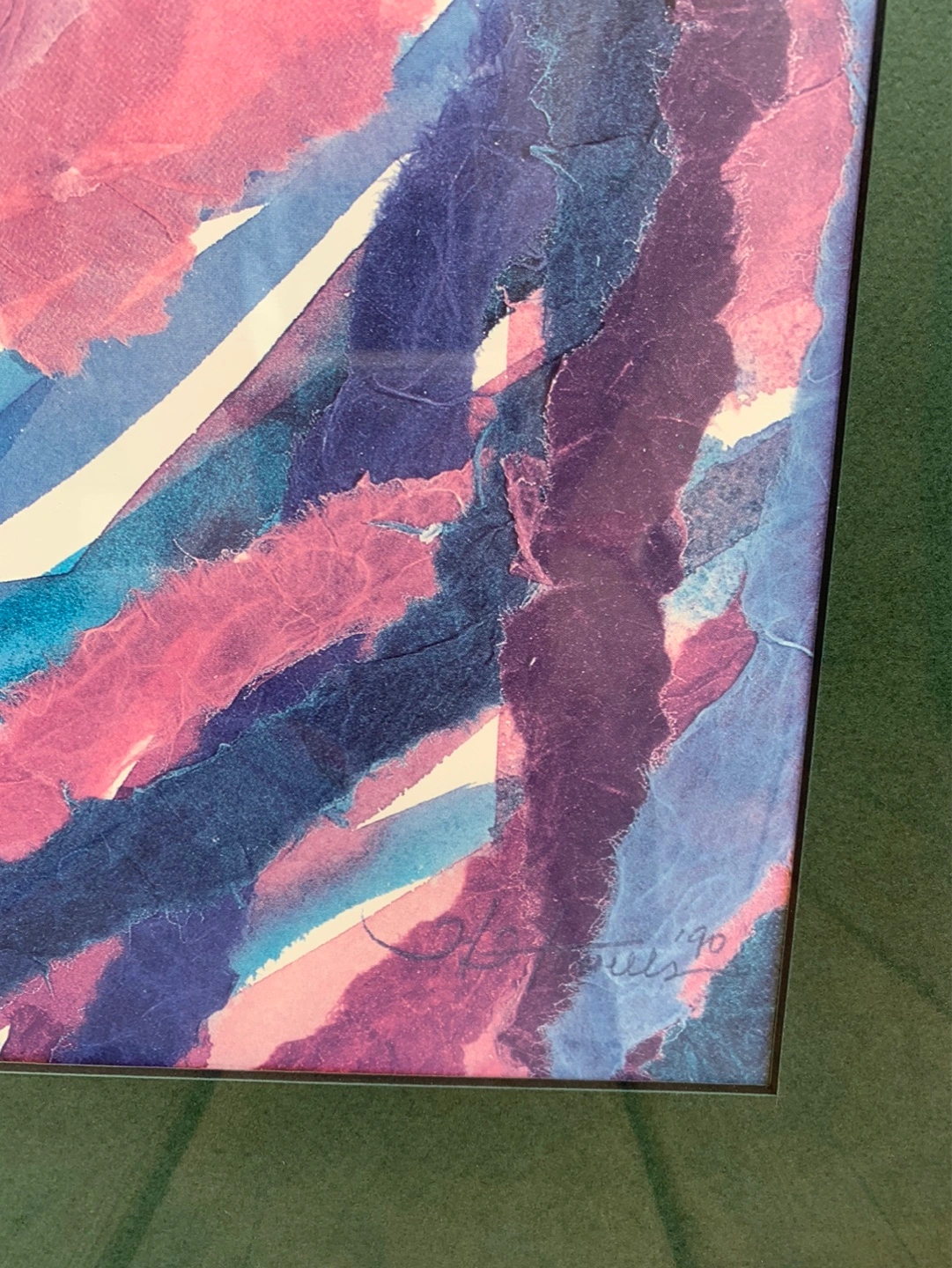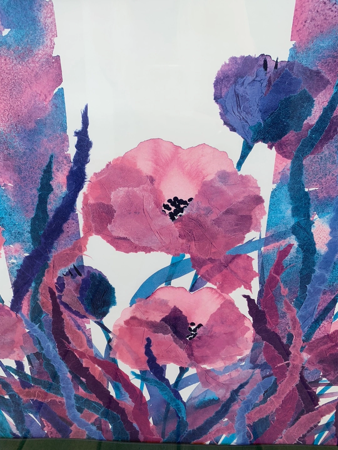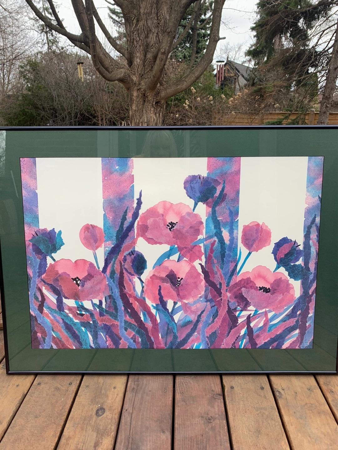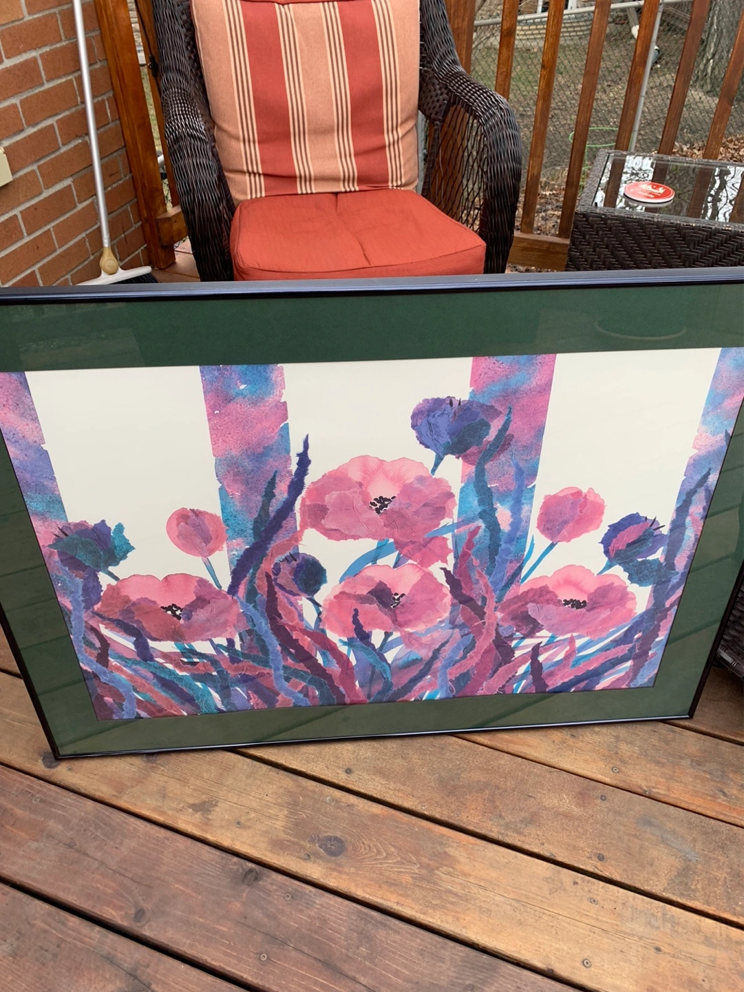 Large gorgeous framed watercolour print featuring pink poppies and purple foliage. Artist is Henry Howells who liked to show abstract florals in his work. It shows some texture throughout the picture. It has a dark green mat and a black metal frame that is ready to hang with a wire on the back. It is signed and dated '90. Measures 29” tall and 40” wide. Would look great over a couch or a buffet!