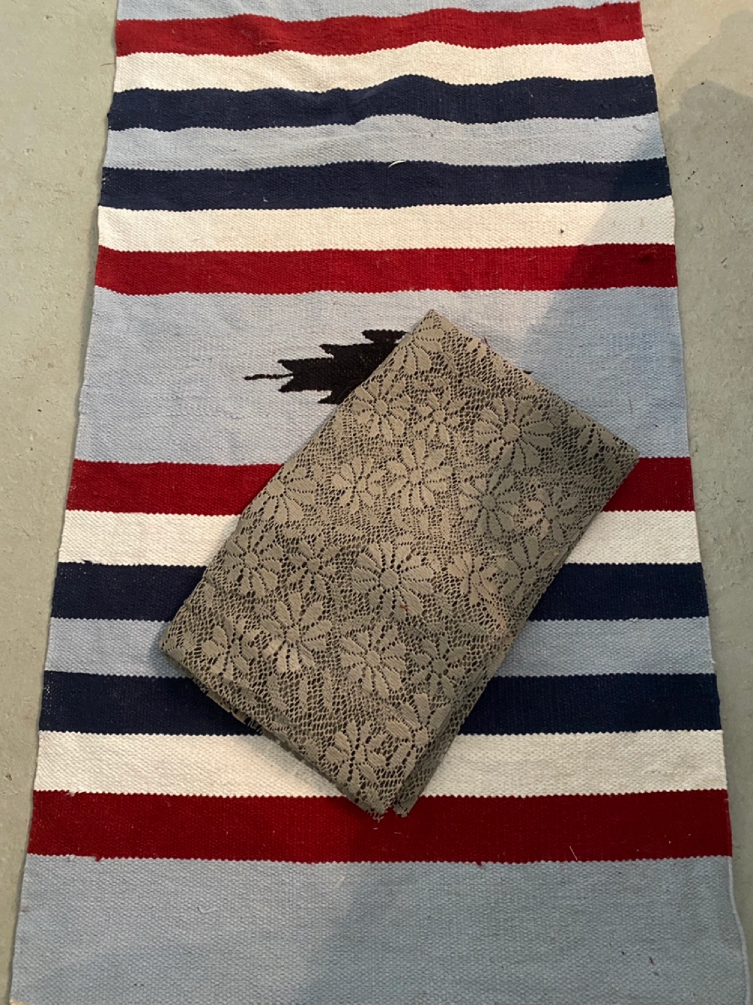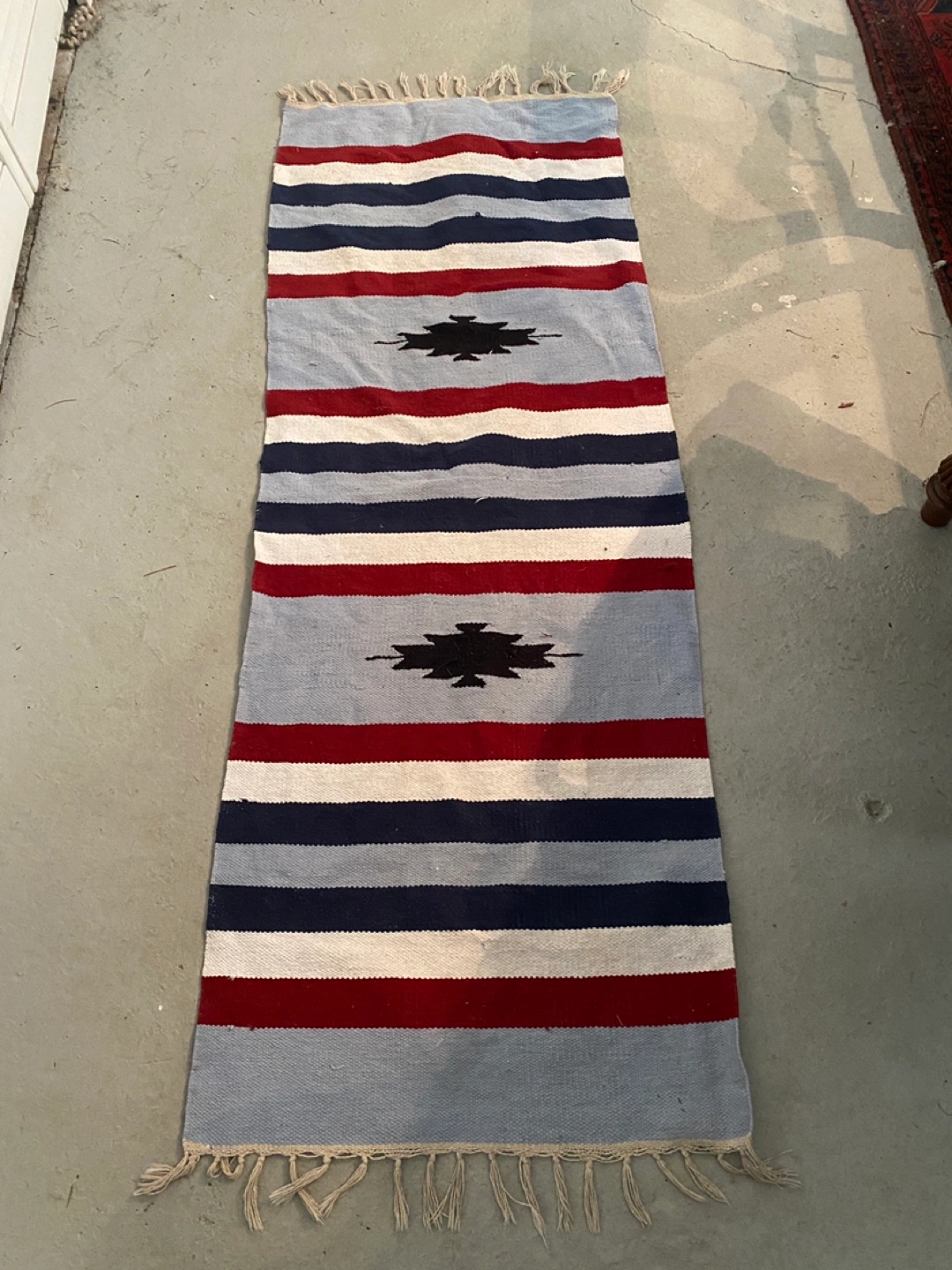 Horizontal stripes in red, blue, and white. Geometric designs. Fringe on both ends.