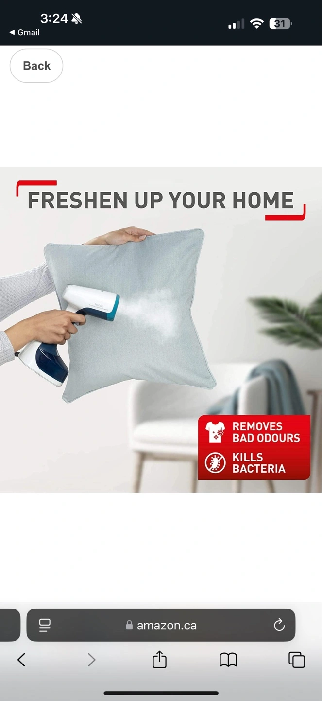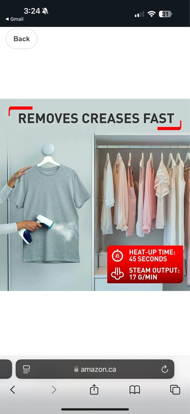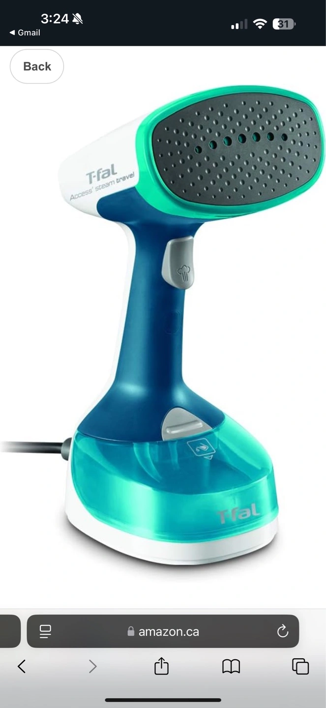 Lightweight and compact travel steamer. Dual voltage setting. Removes creases fast. Steam brush attachment included. Heats up quickly. Small and easily stored. Added safety with standing base.