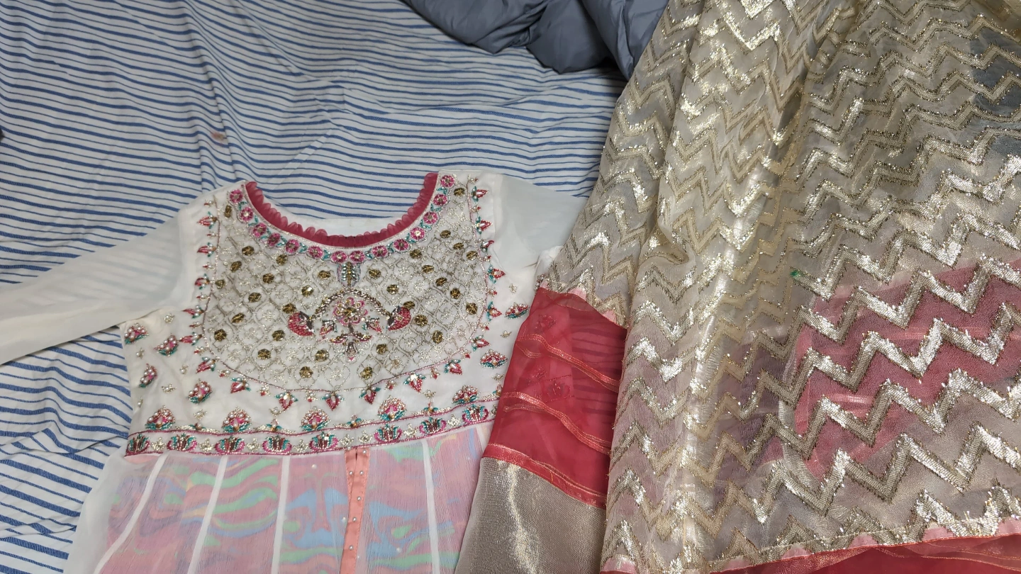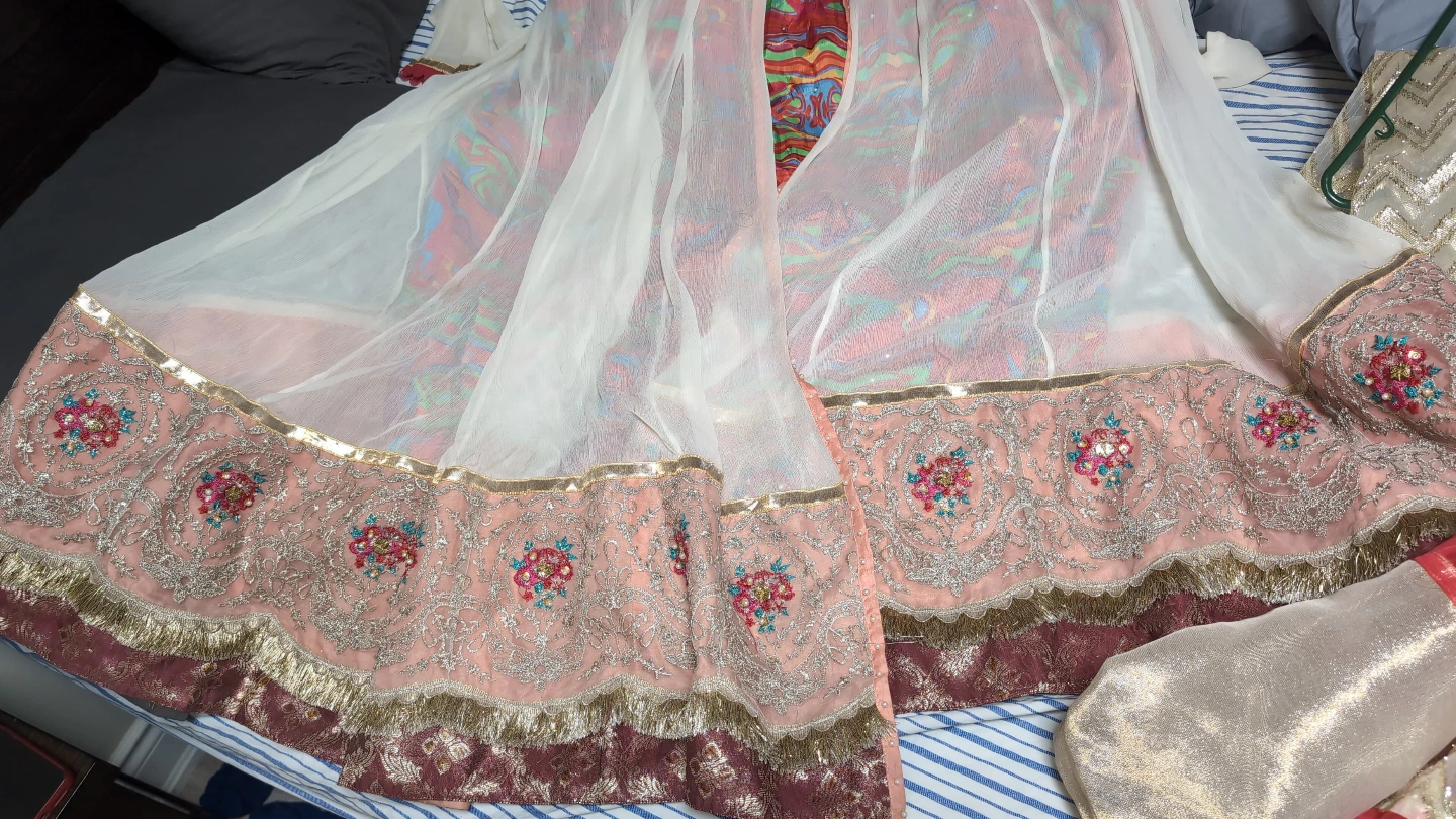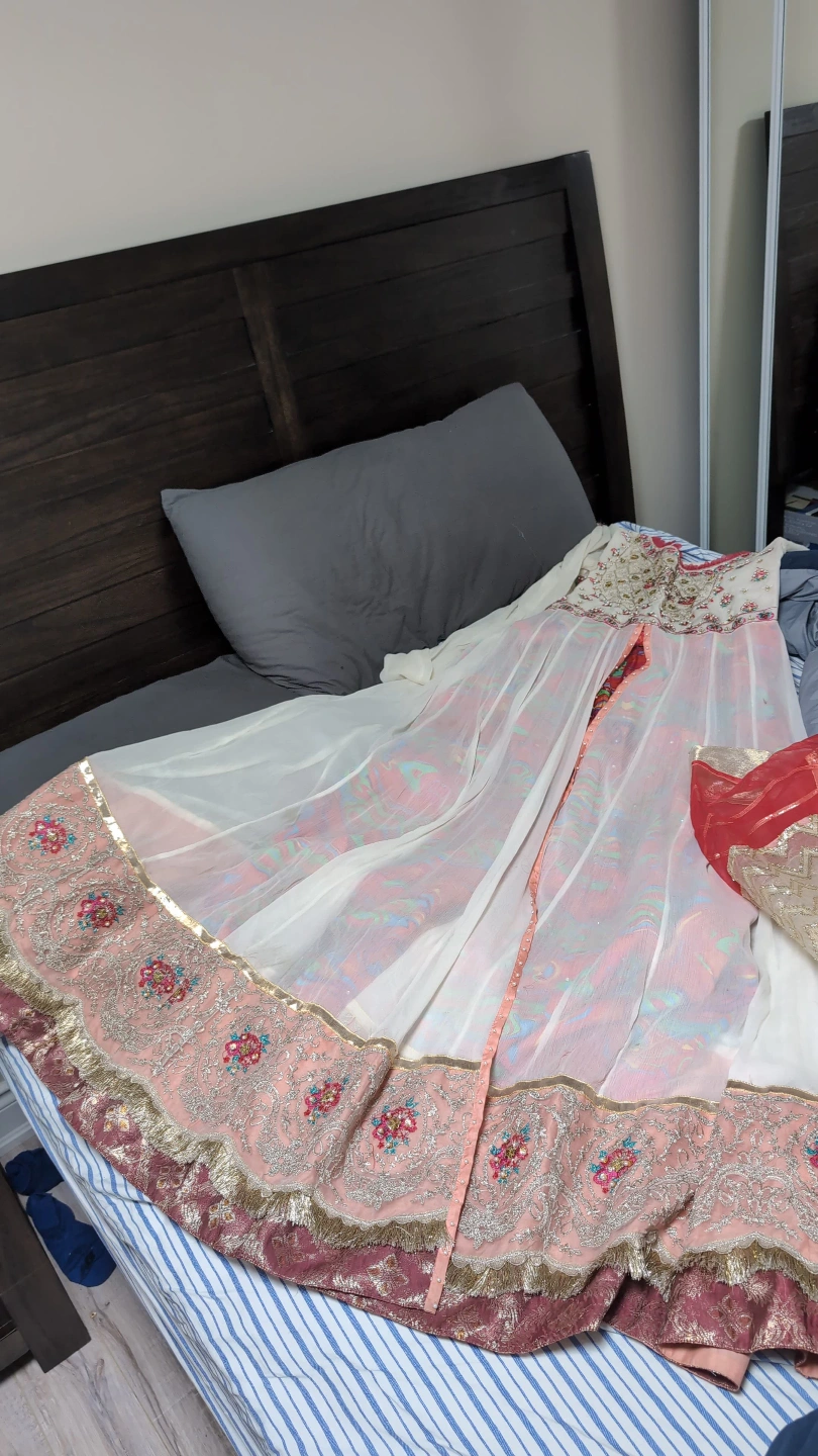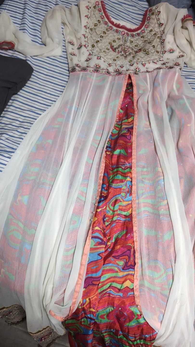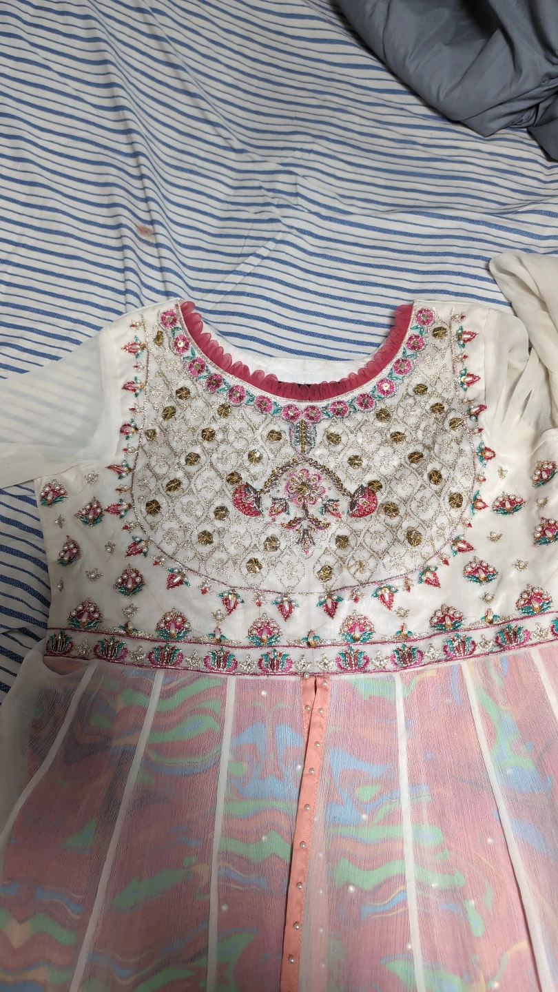 35Beautiful, fancy frock Features long sleeves, a high neckline, and colourful, vibrant detailing. Comes with matching dupatta. Cream and peach colours. Ready to wear.