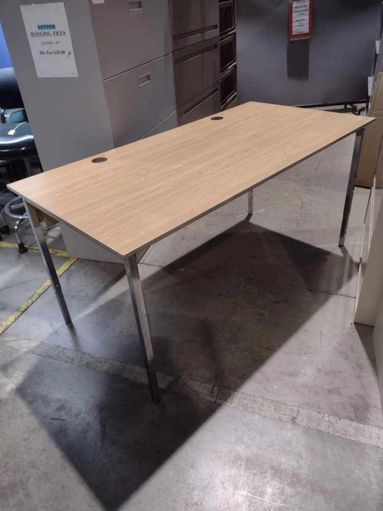 Rectangular desk. Light coloured wood top. Adjustable chrome legs. Grommets for wire management. Simple design. 8 Available. Measure approximately 5' wide x 2.5' deep. Height adjustable from approximately 23" to 29" tall. In very good condition. Have chrome legs. $100 each plus HST. Pick up near Gage and Belmont in Kitchener Monday-Friday from 12-5.