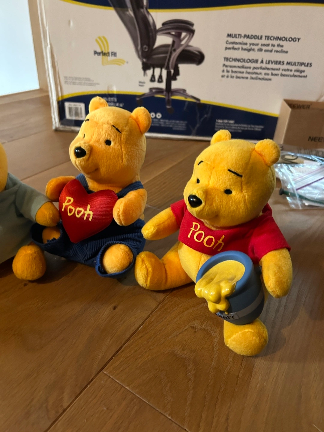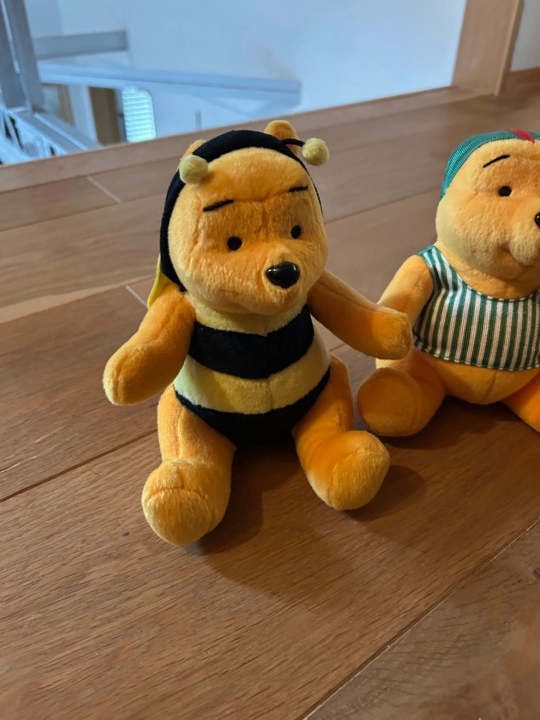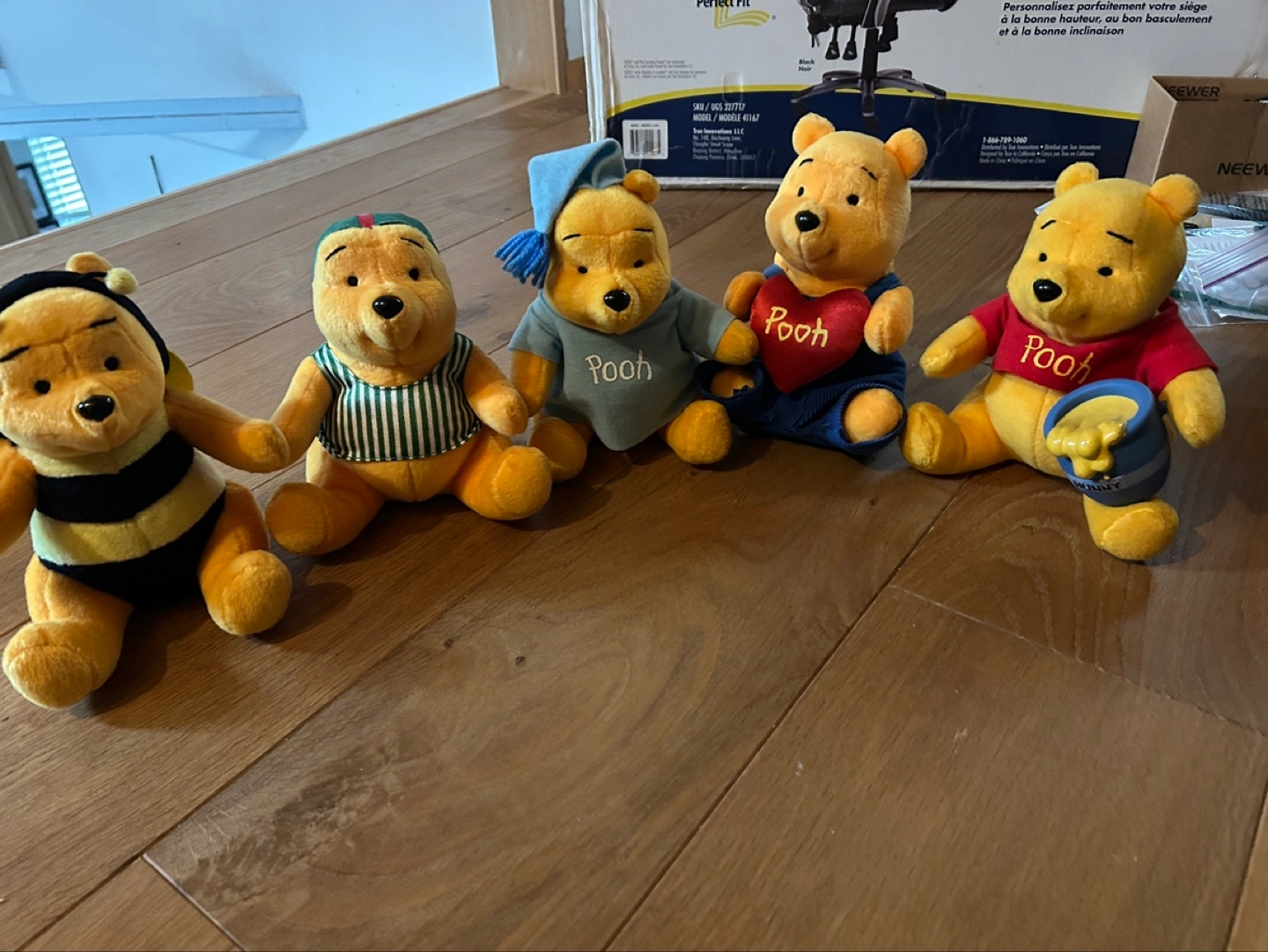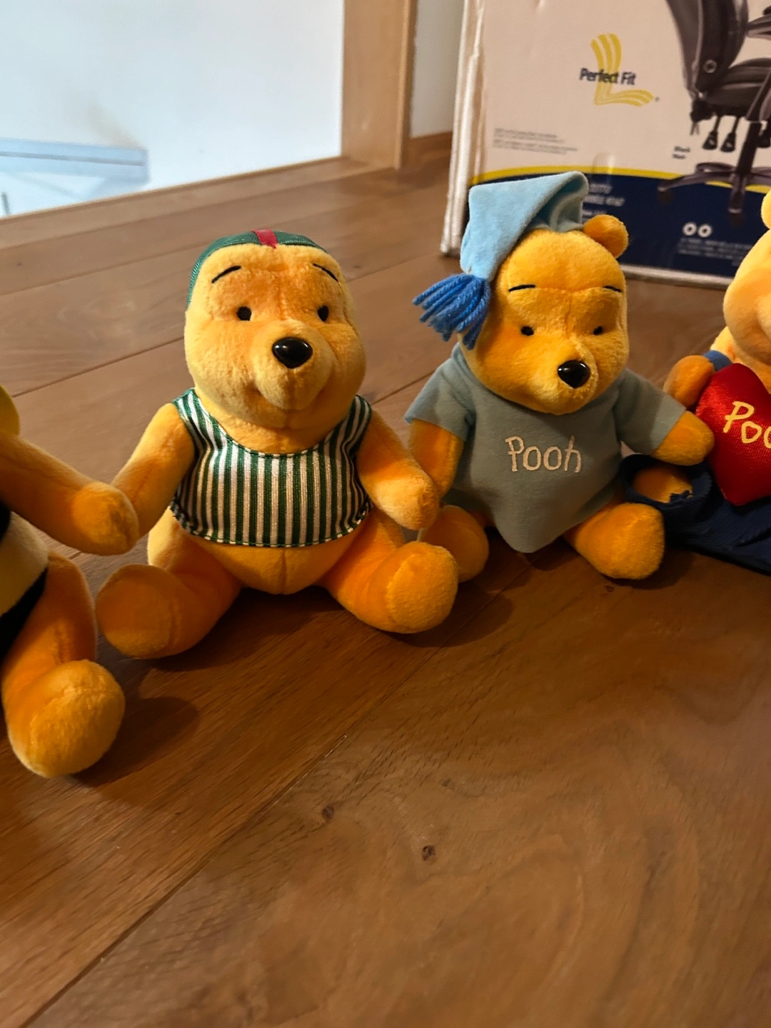 Collection of five Winnie the Pooh plush toys. Various outfits including bee costume, pyjamas, and sailor shirt. Small size, collectible.
