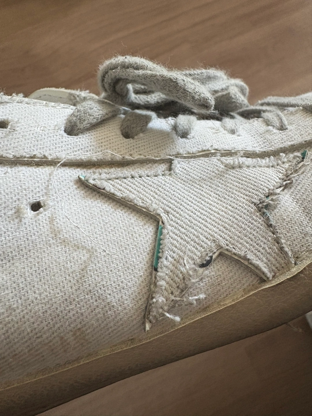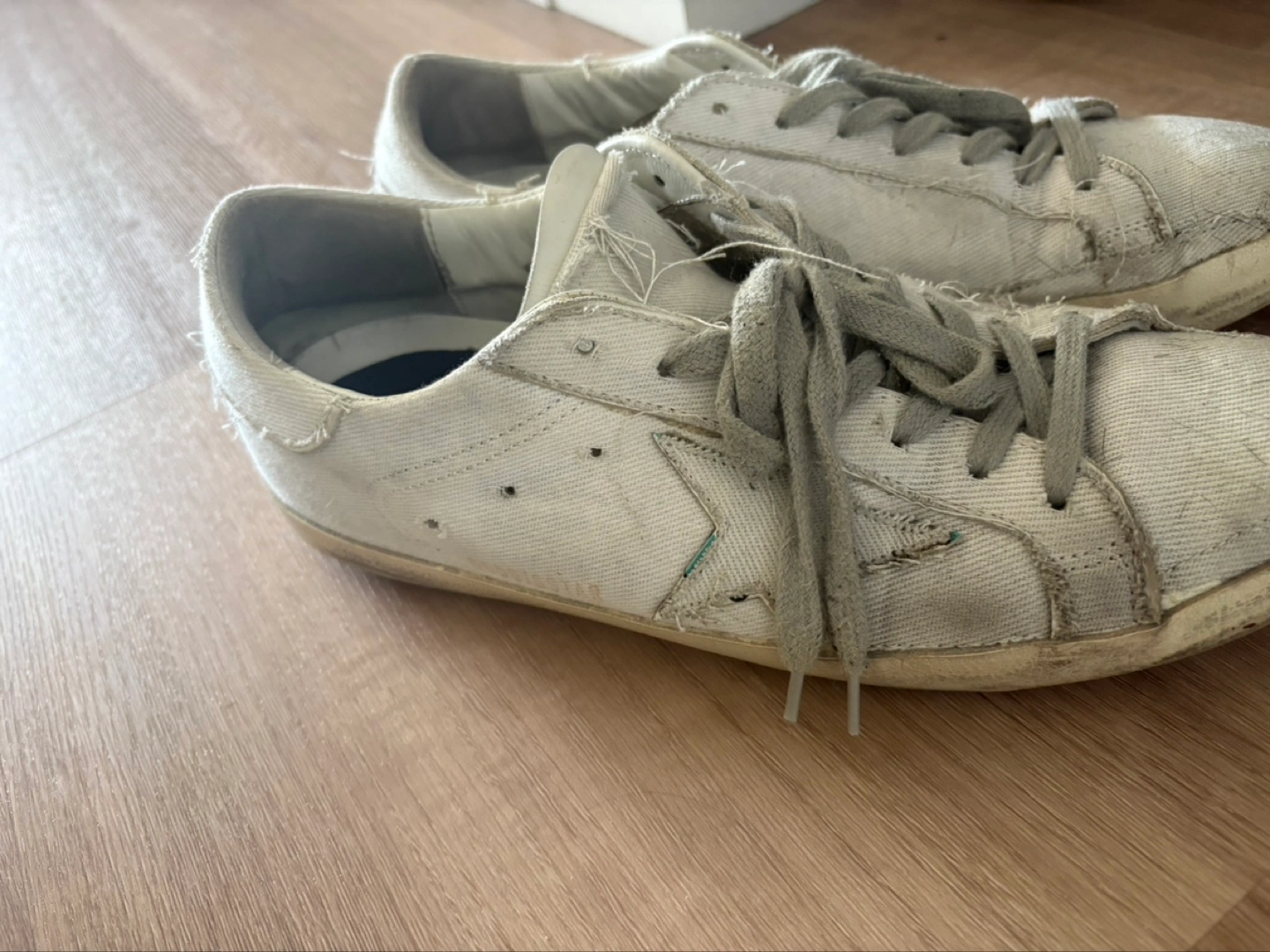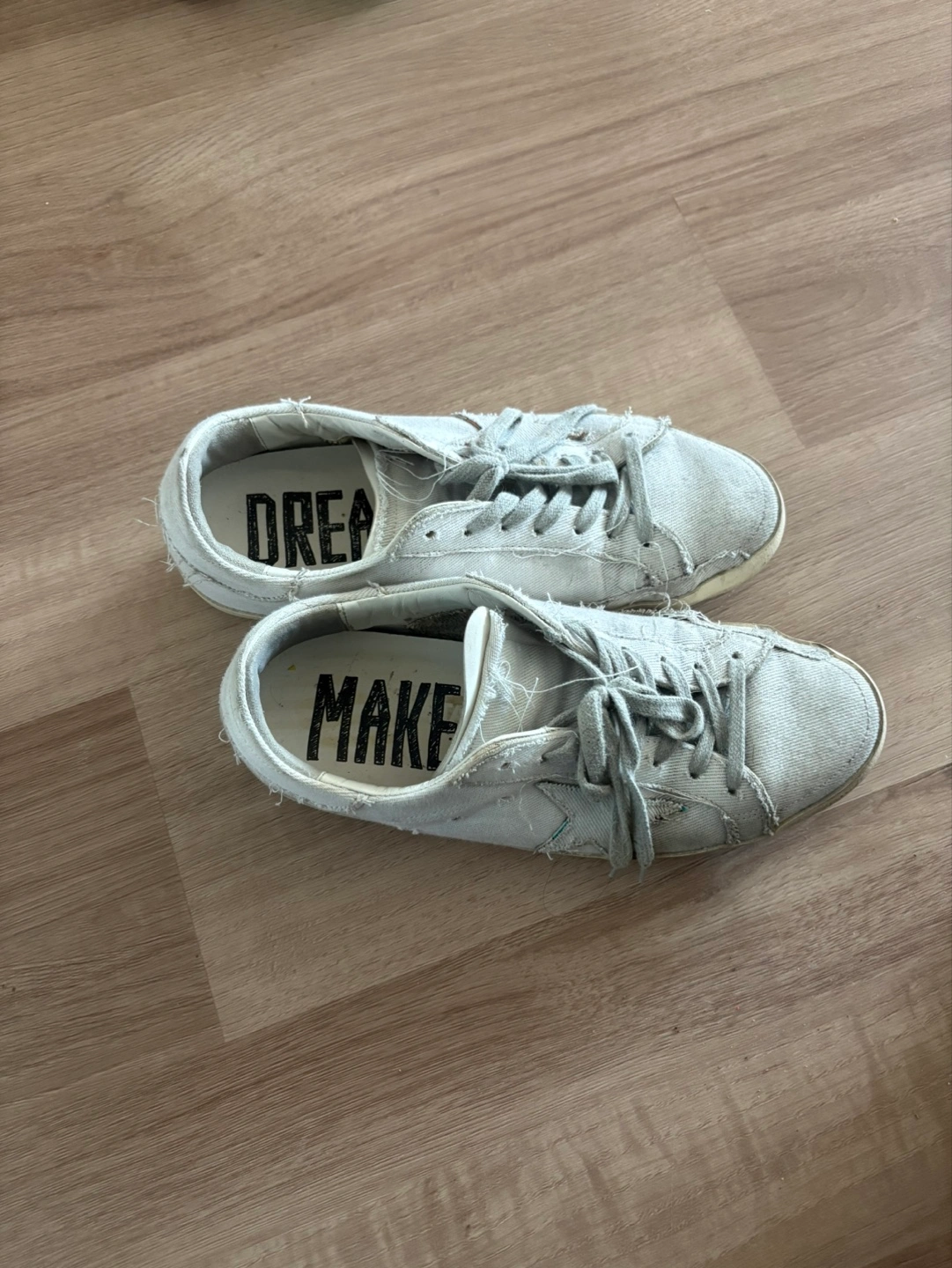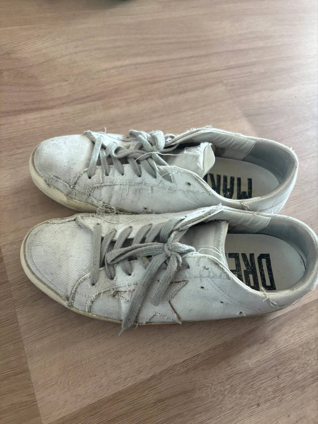 Pre-owned Golden Goose Superstar sneakers. White canvas upper. Distressed look. Grey laces. DREAM MAKER on insole. Some fabric on the shoes is meant to be ripped off(photo attached) has different colours under the fabric so you can enjoy different styles