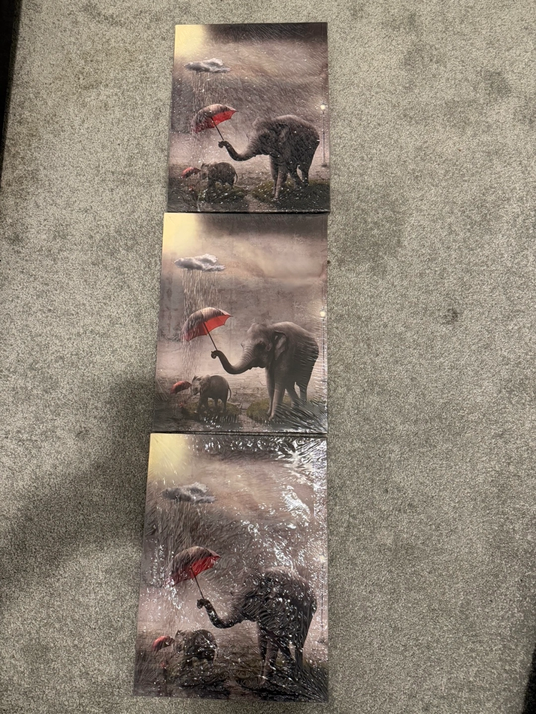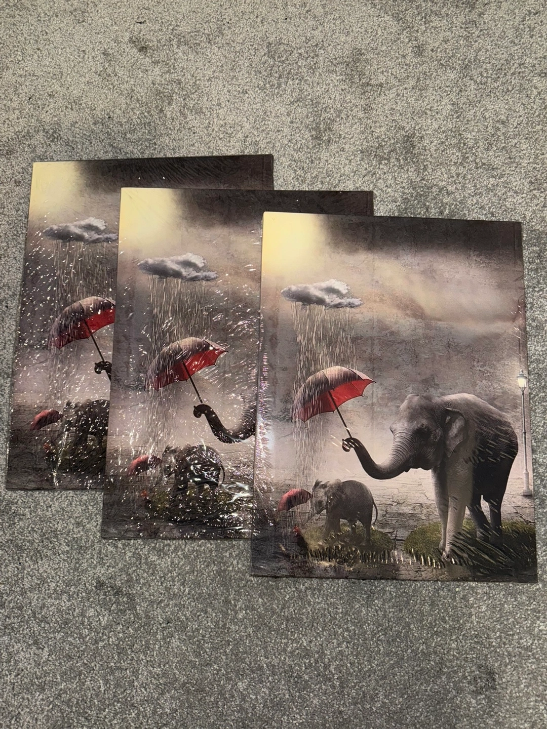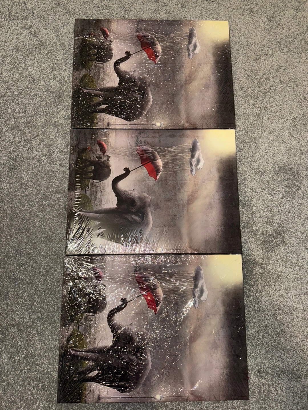 261Beautiful triptych canvas wall art. Features elephants in the rain. Ready to hang. New, still in plastic.