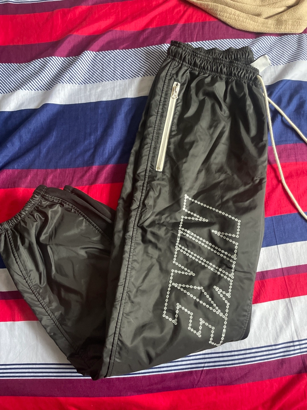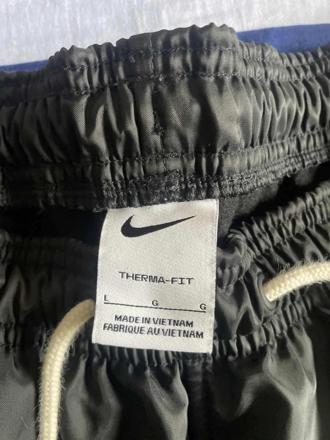 Nike Therma-FIT black pants. Size large. Features side zippers and drawstring waist. Embroidered logo detail on one leg. Excellent condition.