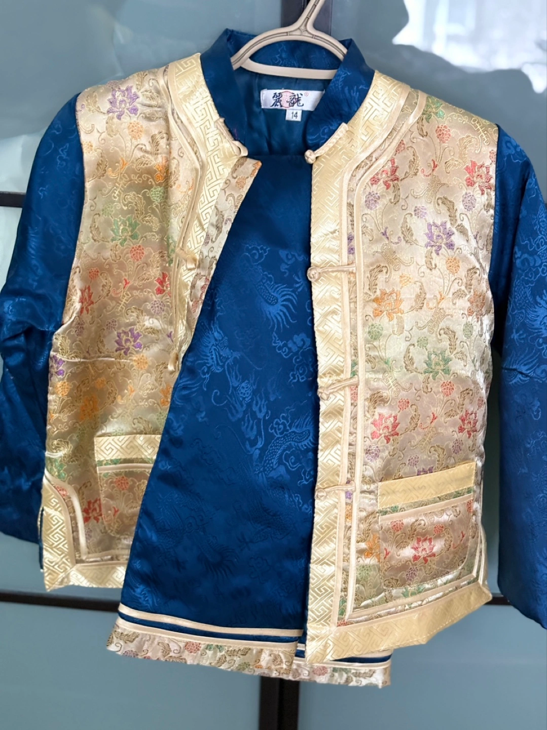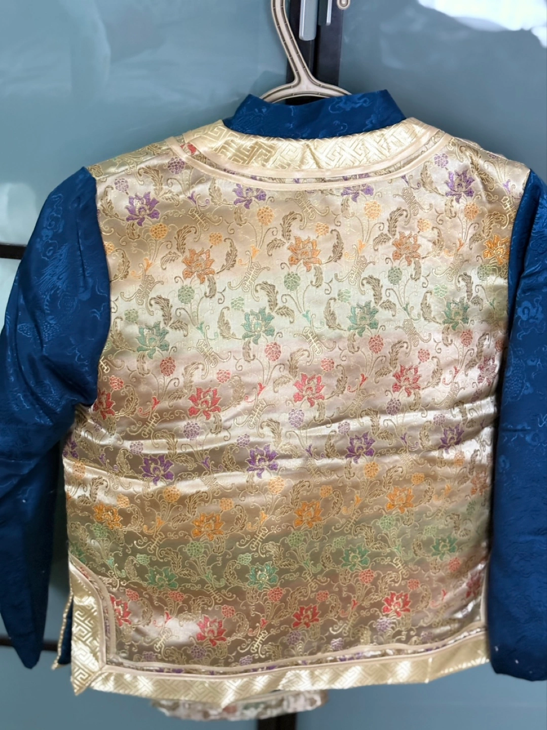 Beautiful two-piece outfit. Features a gold patterned jacket and dark blue pants. Looks to be suitable for a special occasion. Excellent condition.